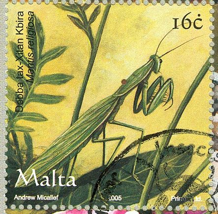 Hier eine Mantis religiosa auf einer Malteser Marke.