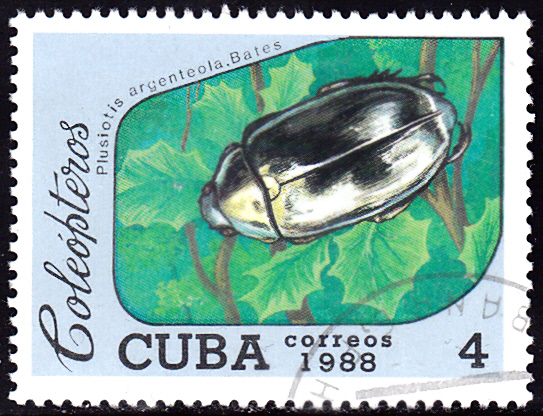 Auf einer Marke aus Kuba (MiNr 3194) sehen wir einen Chrysina argenteola. Michel verwendet noch den alten Namen Plusiotis argenteola.