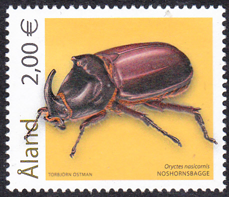 Diese Marke der Alandinseln (MiNr 261) zeigt einen Nashornkäfer (Oryctes nasicornis). Die Marke ist im kombinierten Offsetdruck und Prägedruck hergestellt. Der Käfer ist "erhaben".