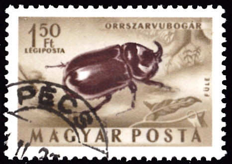 Aus Ungarn kommt diese Marke (MiNr 1361) mit einem Nashornkäfer (Oryctes nasicornis).
