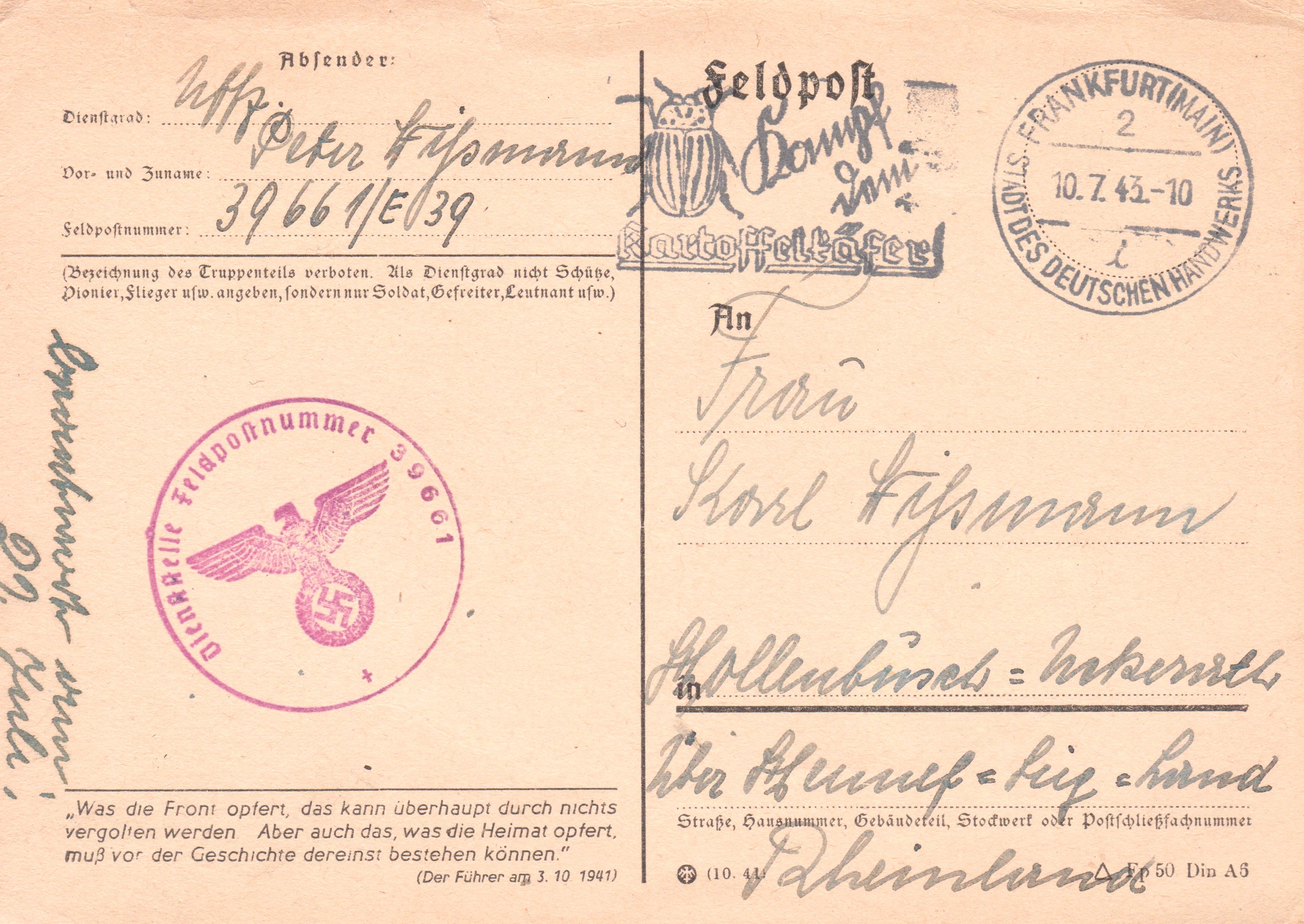 Feldpostkarte mit Freigabestempel "Dienststelle Feldpostnummer 39661" mit Maschinenstempel mit Propagandaeinsatz "Kampf dem Kartoffelkäfer!" aus "FRANKFURT(MAIN) 2 STADT DES DEUTSCHEN HANDWERKS":