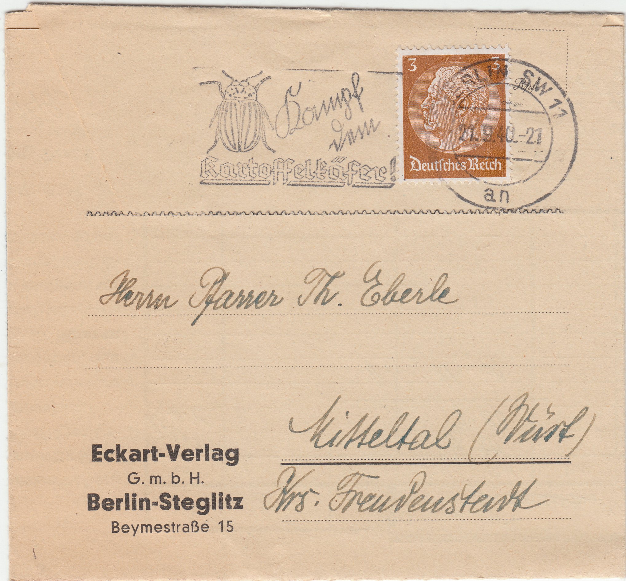 Diese Drucksache wurde am 21.09.1940 in BERLIN SW 11 (an) mit einem solchen Maschinenstempel versehen: