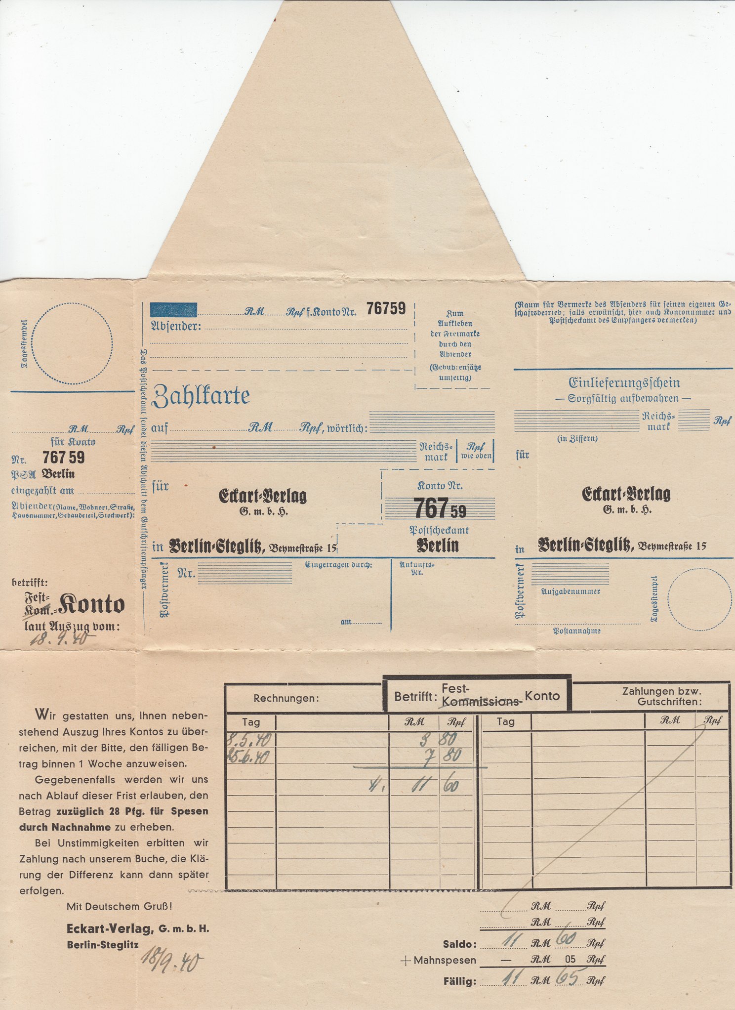 Es handelt sich wie man sieht um eine Zahlkarte, die als Faltbrief verschickt wurde: