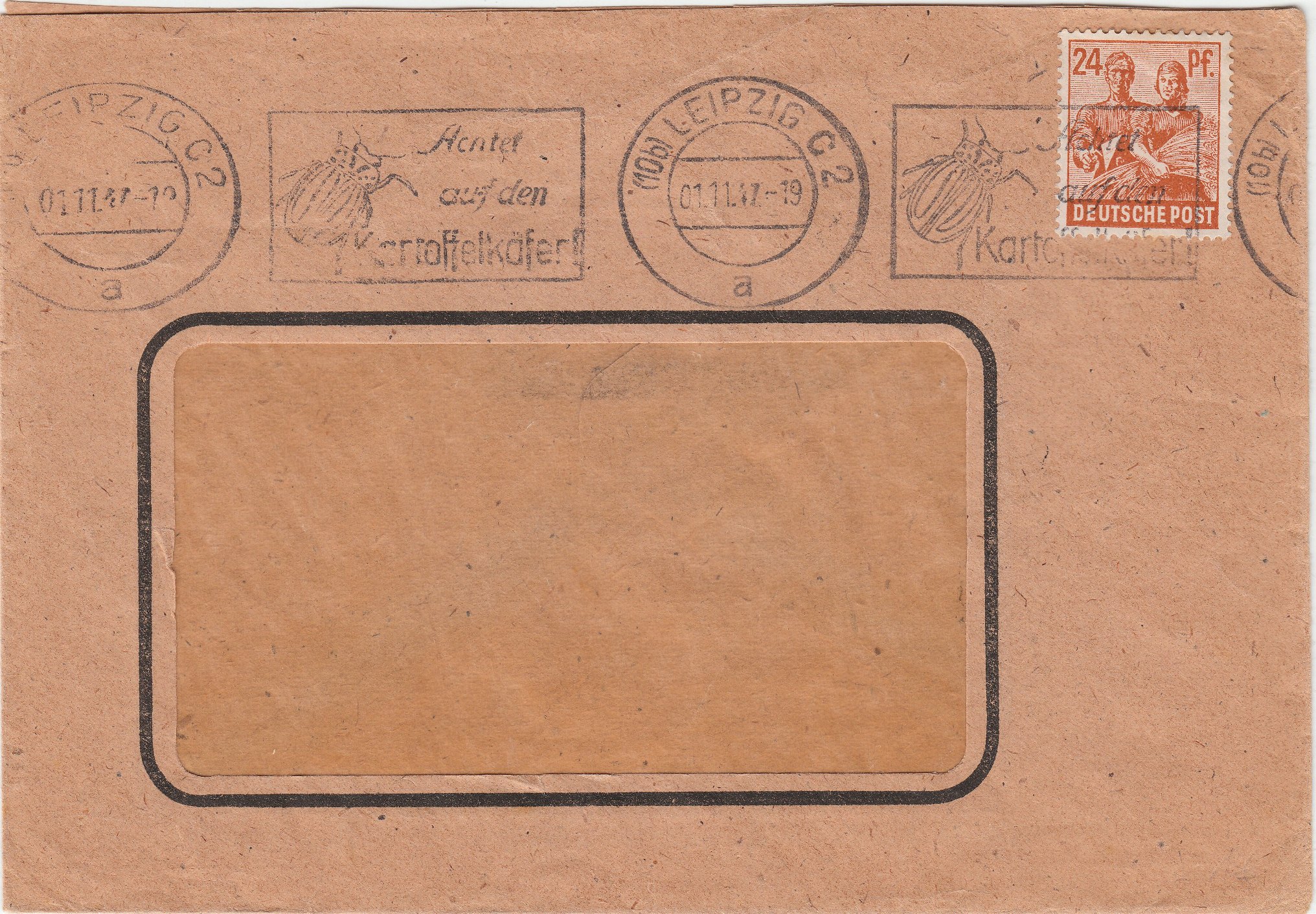 In der SBZ wurde zu dieser Zeit in zahlreichen Orten in Maschinenstempeln dieser Texteinsatz "Achtet auf den Kartoffelkäfer!" benutzt: