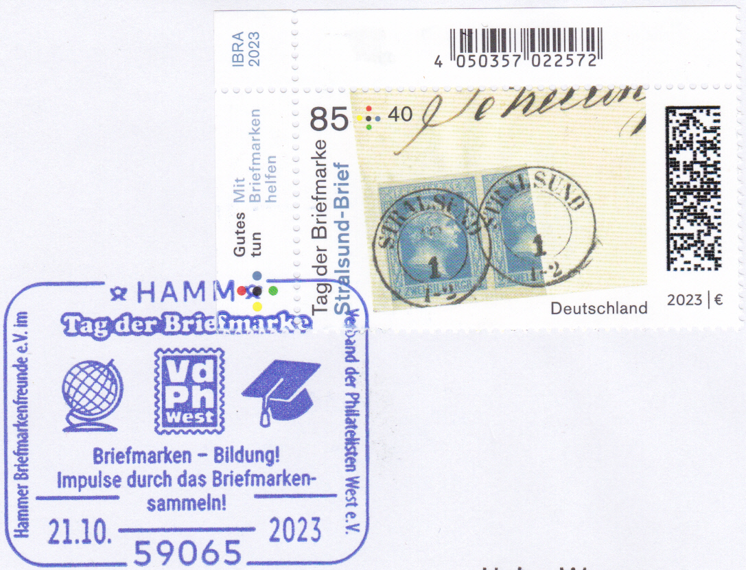 Sonderstempel vom 21.10.2023 aus Hamm zum Tag der Briefmarke 2023 des Philatelisten-Verbandes West e.V..