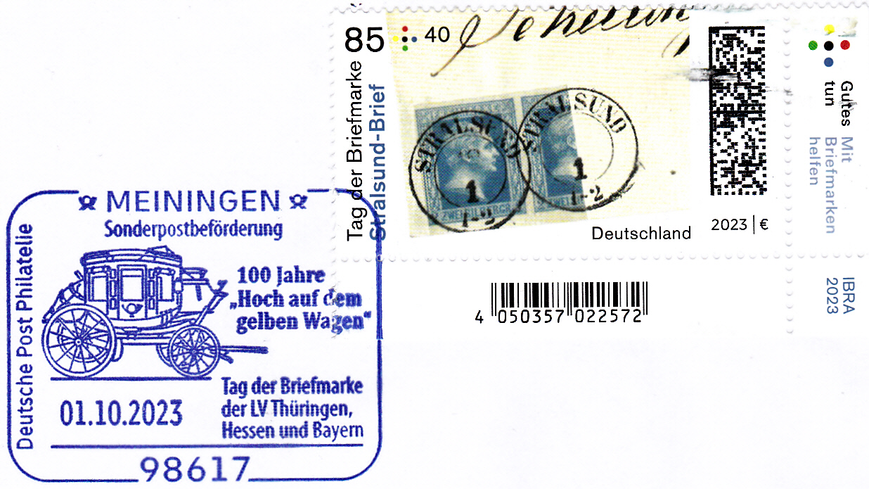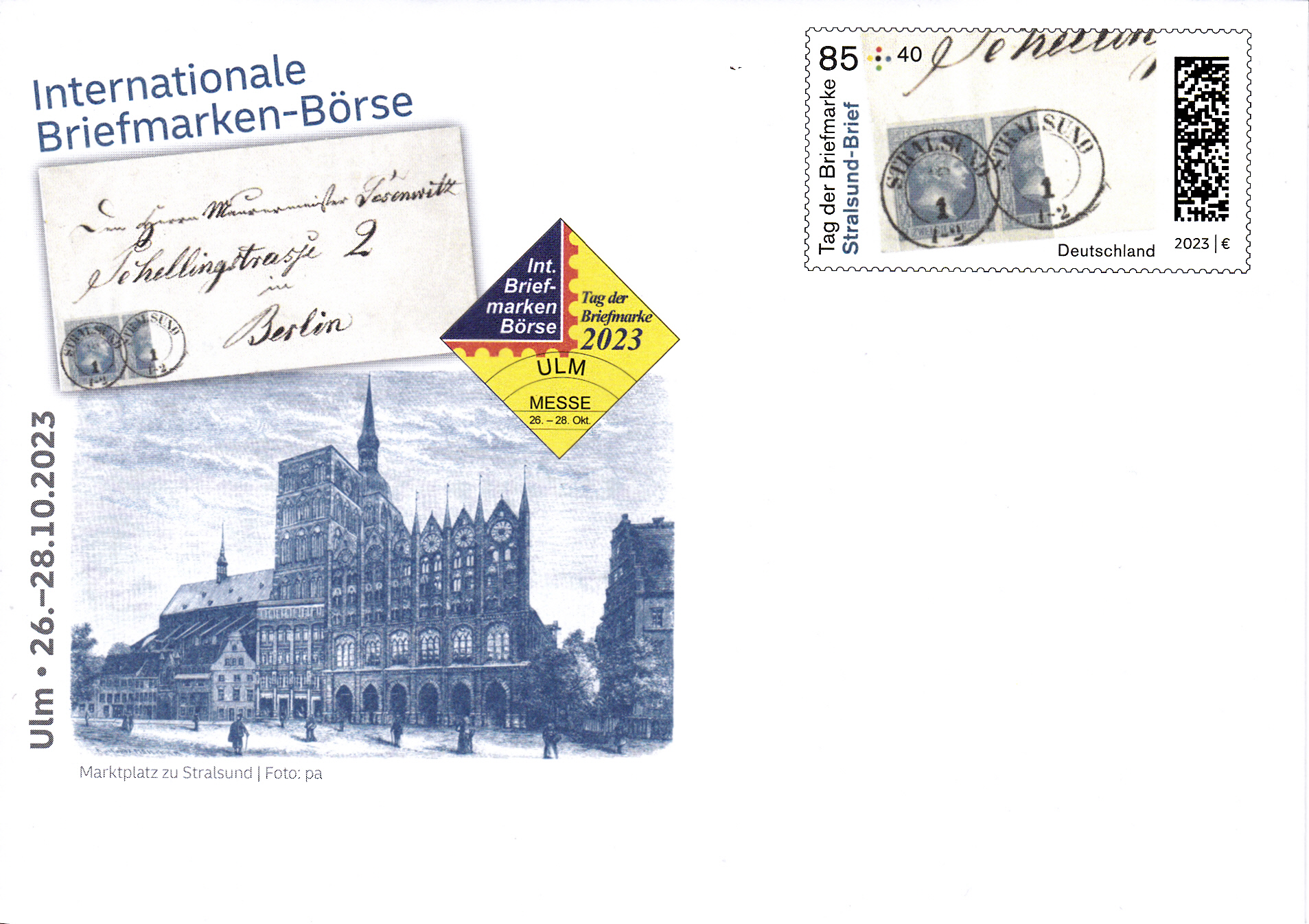 Auch zur Internationalen Briefmarken-Börse in Ulm ist eine Messe-Ganzsache mit dem Wertstempel im Muster der Marke zum Tag der Briefmarke 2023 erschienen.