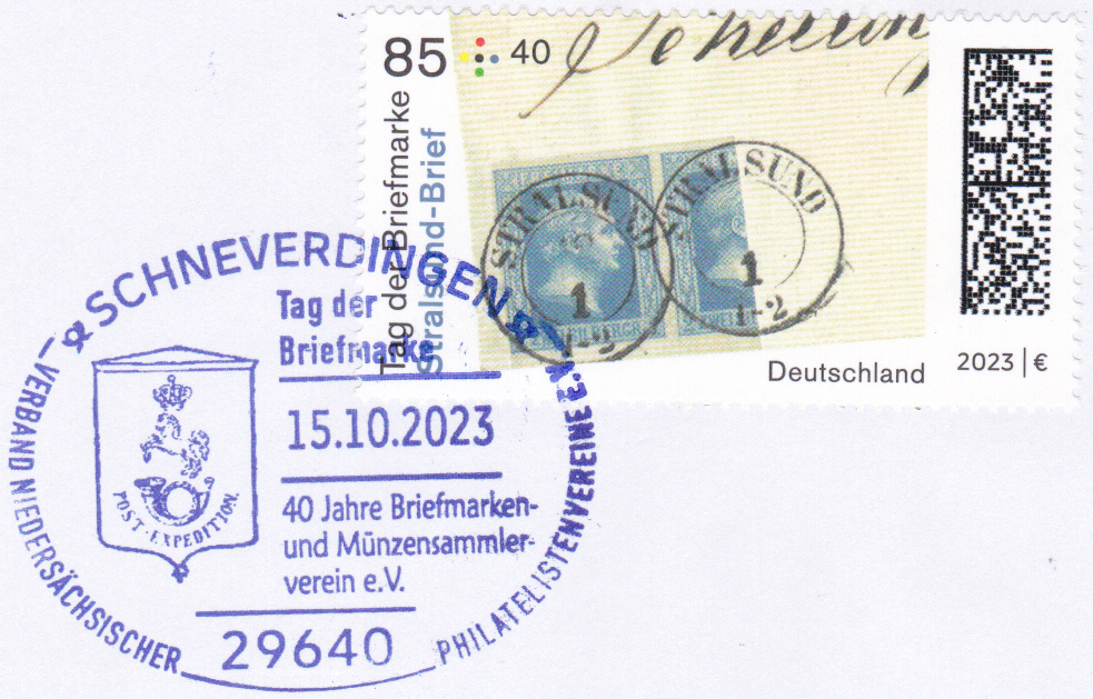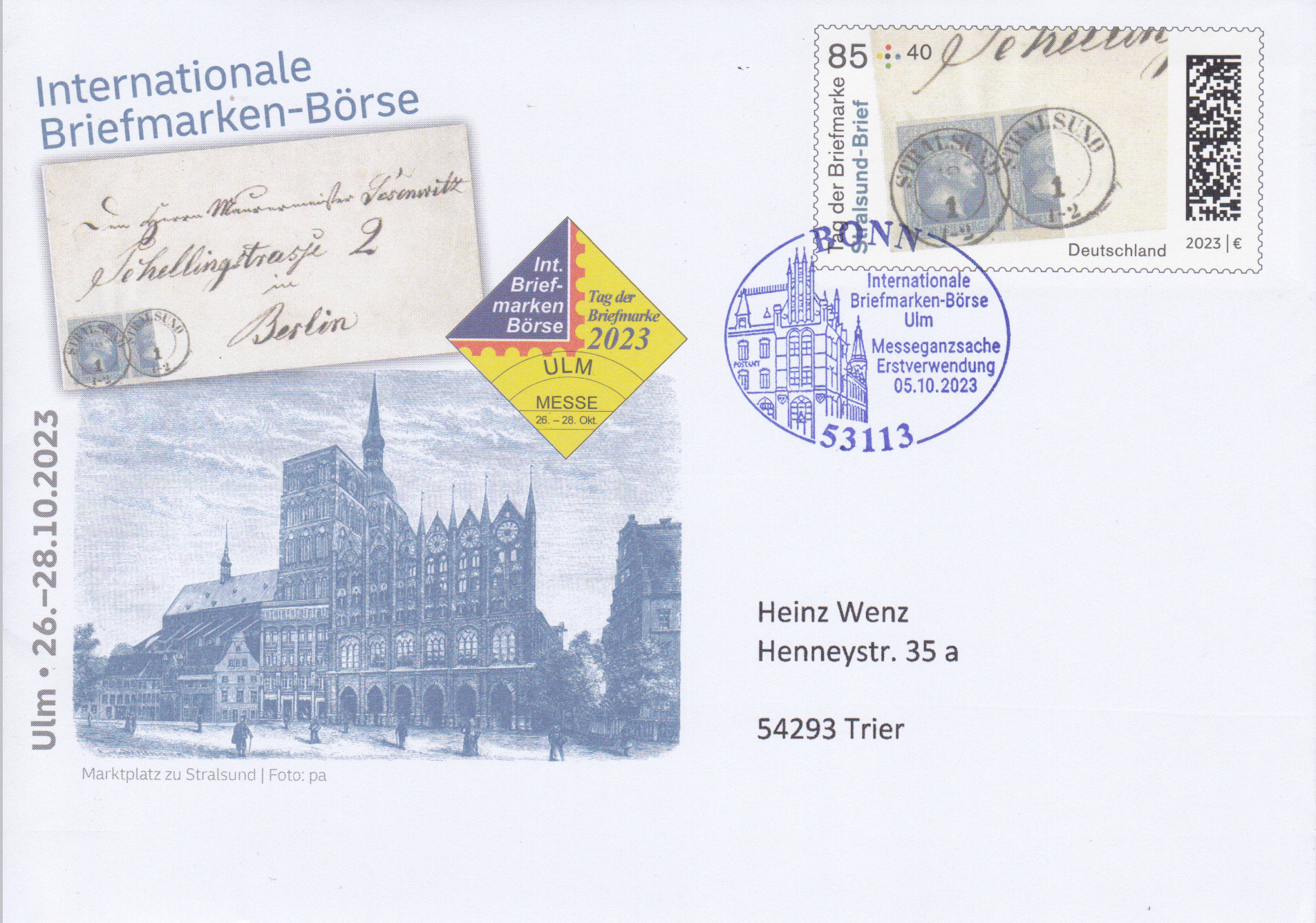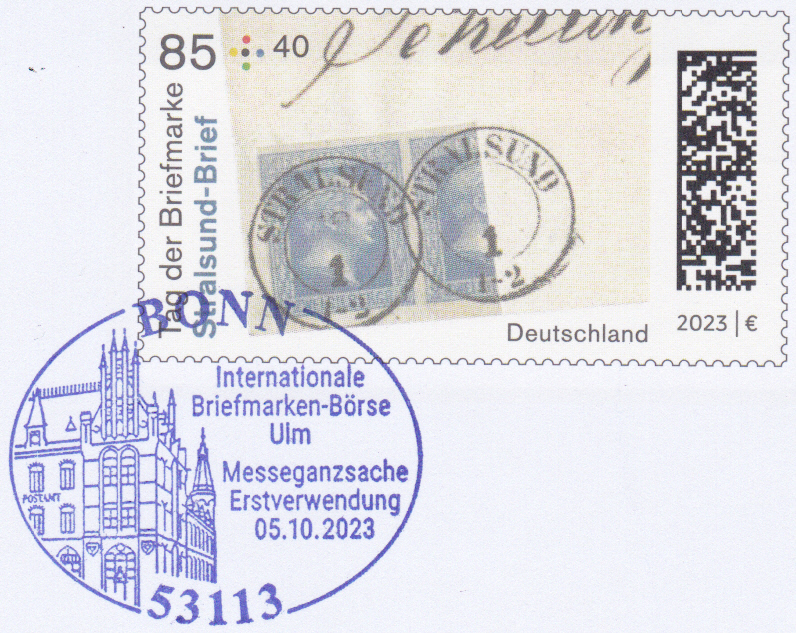 Messe-Ganzsache zur Internationalen Briefmarken-Börse in Ulm mit dem Wertstempel im Muster der Marke zum Tag der Briefmarke 2023 und dem Erstverwendungsstempel Bonn.