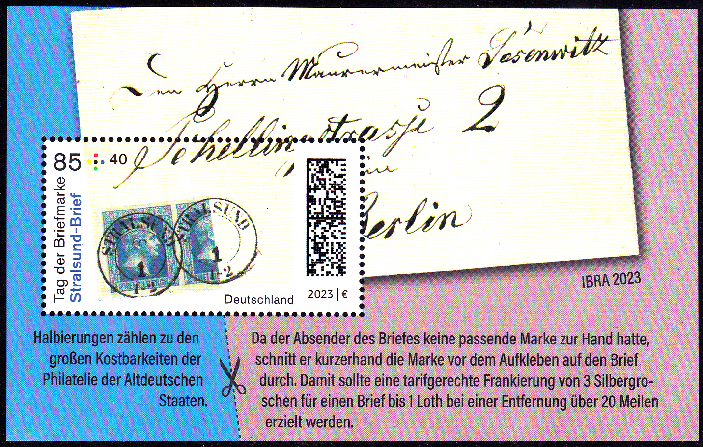 Die Marke zum Tag der Briefmarke 2023 wurde auch in einem Block (MiNr Block 91) gedruckt. Auf dem Blockrand wird ein weiterer Teil des Stralsund-Briefes gezeigt.