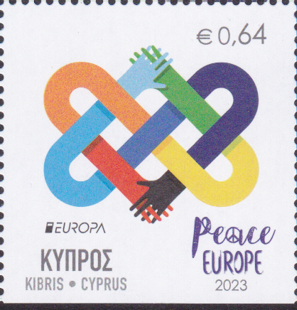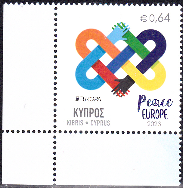 Die Europamarken 2023 sind in Zypern am 6. Mai 2023 zum Thema "Frieden - der höchste Wert der Menschheit" erschienen. Die Marke zu 0,64€ zeigt das Gemeinscahftsmotiv "Herzförmig verknotete Arme mit verschränkten Händen". Die vierseitig gezähnte Marke hat eine Auflage von 55.000 Stück. Hier zeige ich eine Marke vom Eckrand.