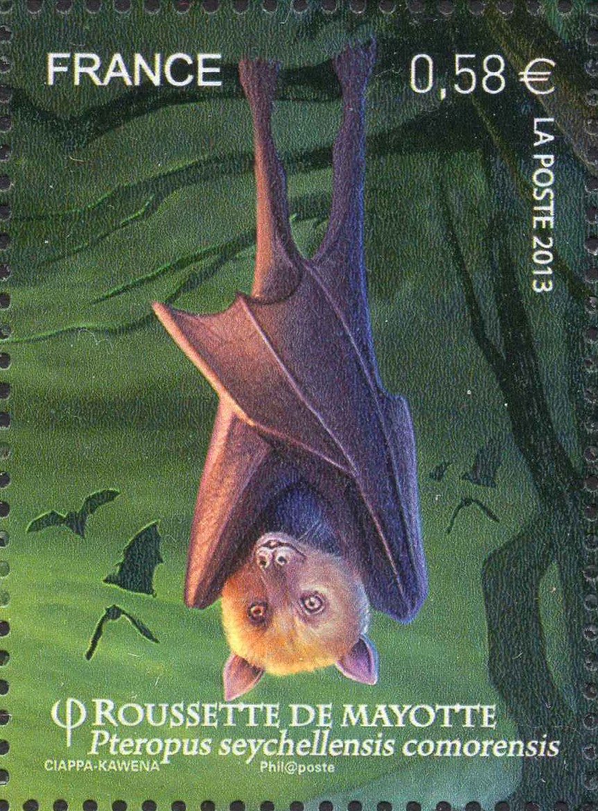 Eine Marke aus Frankreich (MiNr 5558) zeigt einen Seychellen-Flughund (Pteropus seychellensis comorensis). Michel nennt als Name Komorenflughund (Pteropus seychellensis comorensis).