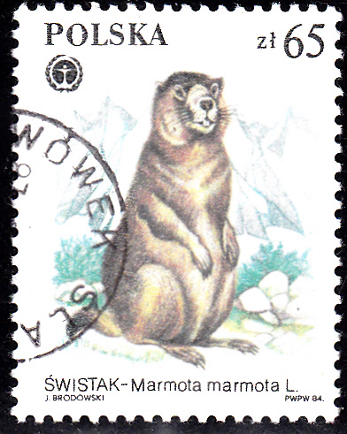 Auf dieser Marke aus Polen (MiNr 2951) wird uns ein Alpenmurmeltier (Marmota marmota) aufrecht stehendes vorgestellt.
