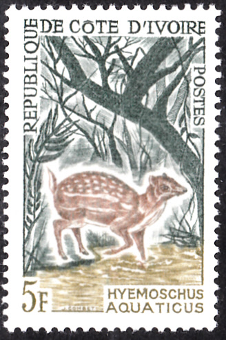 Diese Marke aus Togo (MiNr 262) zeigt uns ein Afrikanisches Hirschferkel (Hyemoschus aquaticus).