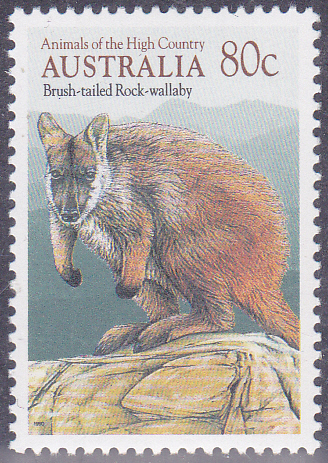 Diese Marke aus Australien (MiNr 1192) zeigt ein Bürstenschwanz-Felskänguruh (Petrogale penicillata). Michel nennt als Name Bürsten-Felskänguruh (Petrogale penicillata).