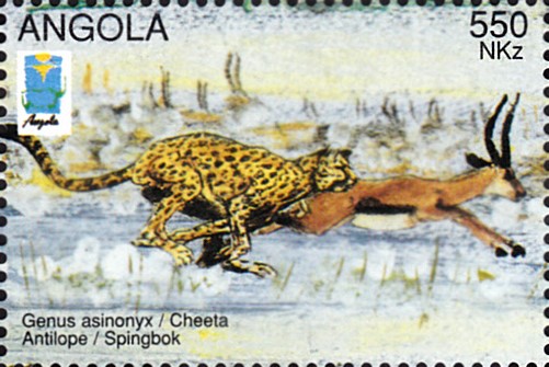 Auf dieser Marke (MiNr 1015) können wir sehen, wie der Gepard mit großer Geschwindigkeit eine Springbockherde verfolgt. Im Michel werden bei dieser Marke die Springböcke fälschlicherweise mit "Gnus" bezeichnet.
