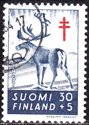 Hier eine Marke aus Finnland (MiNr 480) mit einem Rentier (Rangifer tarandus) im Markenbild.