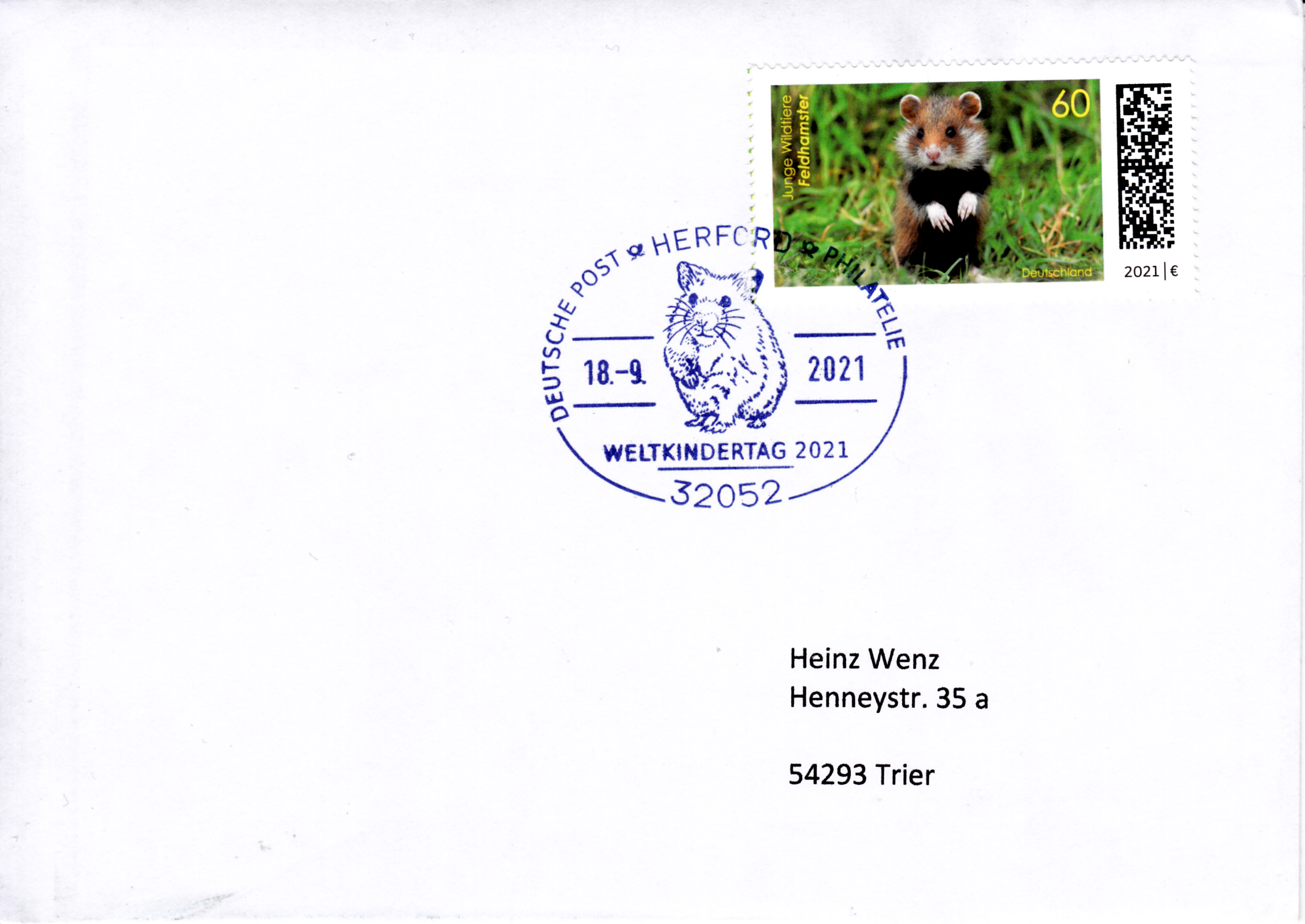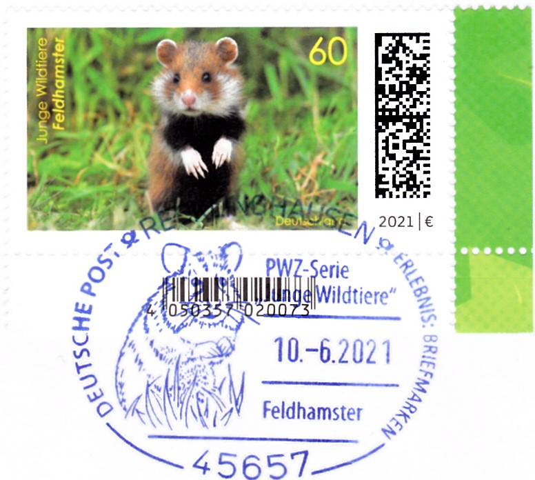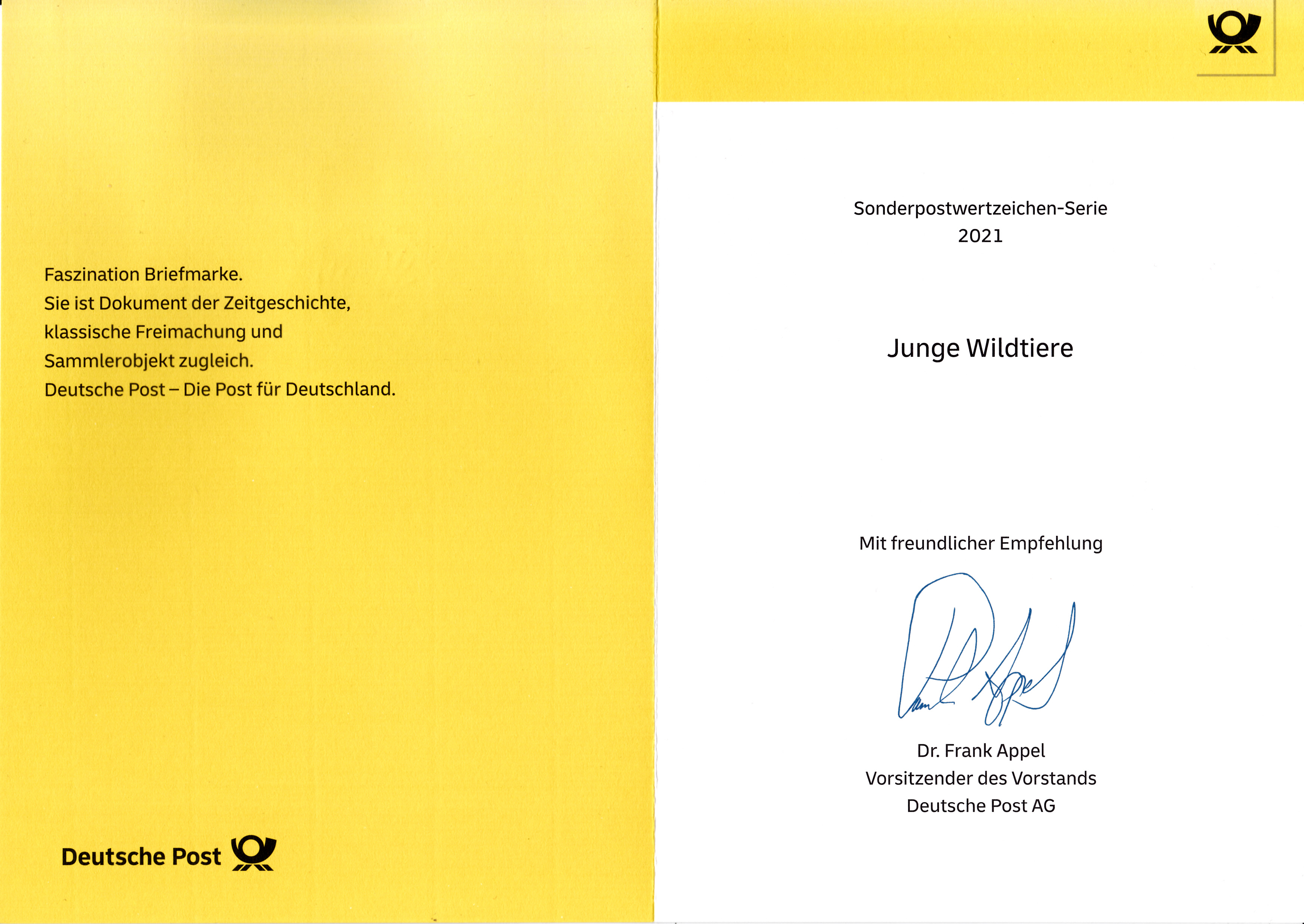 Klappkarte des Vorstandsvorsitzenden der Deutschen Post AG mit je einer Marke der Serie "Tierbabys" (MiNr 3608/3609) mit den Motiven "Feldhamster (Cricetus cricetus)" und "Alpensteinbock (Capra ibex)" und dem Ersttagsonderstempel Bonn.