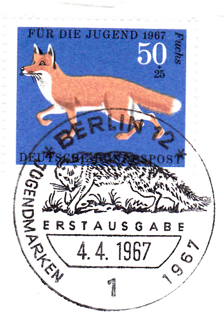 Im Jugendmarkensatz vom 4.4.1967 zeigt die Marke zu 50 + 25 Pf einen Rotfuchs (Vulpes vulpes). Hier zeige ich einen portogerechten Ersttagsbrief per Einschreiben mit dem kompletten Satz und dem Ersttagsonderstempel aus Berlin, der ebenfalls einen Fuchs im Stempelbild zeigt.