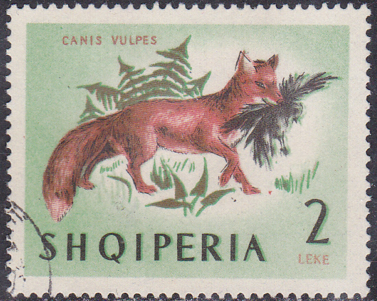 Dieser Rotfuchs (Vulpes vulpes) auf der albanischen Marke (MiNr 817) hat gerade einen Vogel erbeutet.