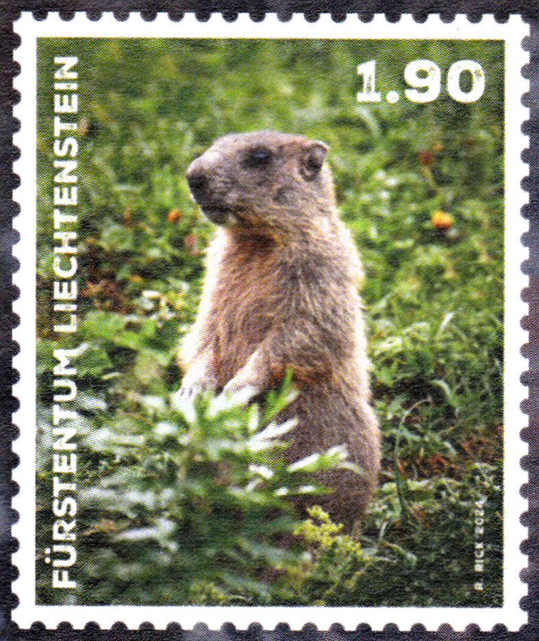 Ein Alpenmurmeltier (Marmota marmota) zeigt diese Marke aus Liechtenstein (MiNr 2115)