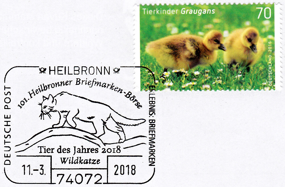 Sonderstempel vom 11.3.2018 aus Heilbronn mit einer Wildkatze, dem Tier des Jahres 2018, im Stempelbild.