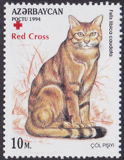 Aus Aserbaidschan kommt diese Marke mit einer Falbkatze (Felis silvestris lybica). Die hier gezeigte Marke (MiNr 361) hat einen roten Bdr.-Aufdruck "Red Cross" und ein rotes Kreuz. Die Marke gibt es auch ohne Aufdruck (MiNr 178). Michel nennt diese Katze Nubische Falbkatze (Felis silvestris lybica).