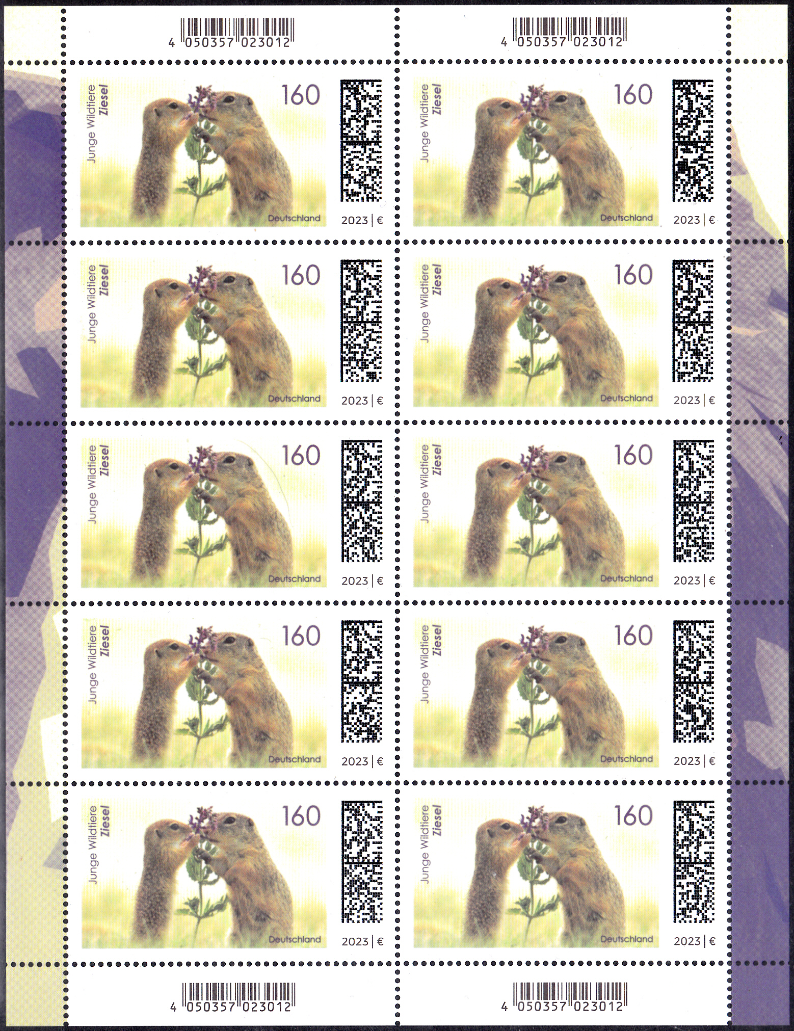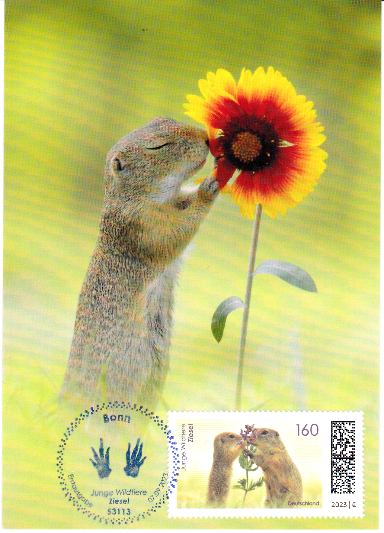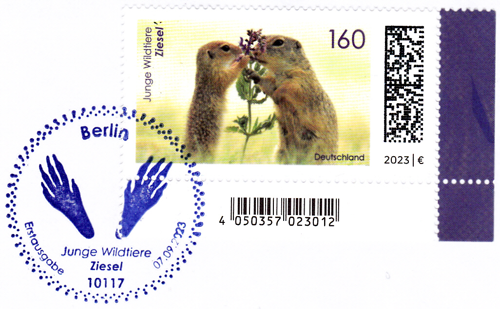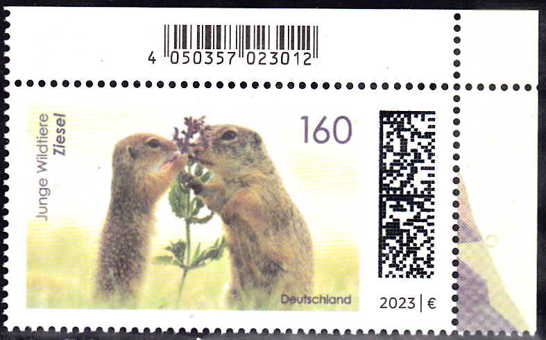 In der Serie "Tierbabys" ist bei der Deutschen Post eine Marke (MiNr 3782) mit zwei Europäischen Ziesel (Spermophilus citellus) an Steppensalbei (Salvia nemorosa) erschienen. Hier zeige ich eine Marke vom Eckrand mit EAN-Codierung.