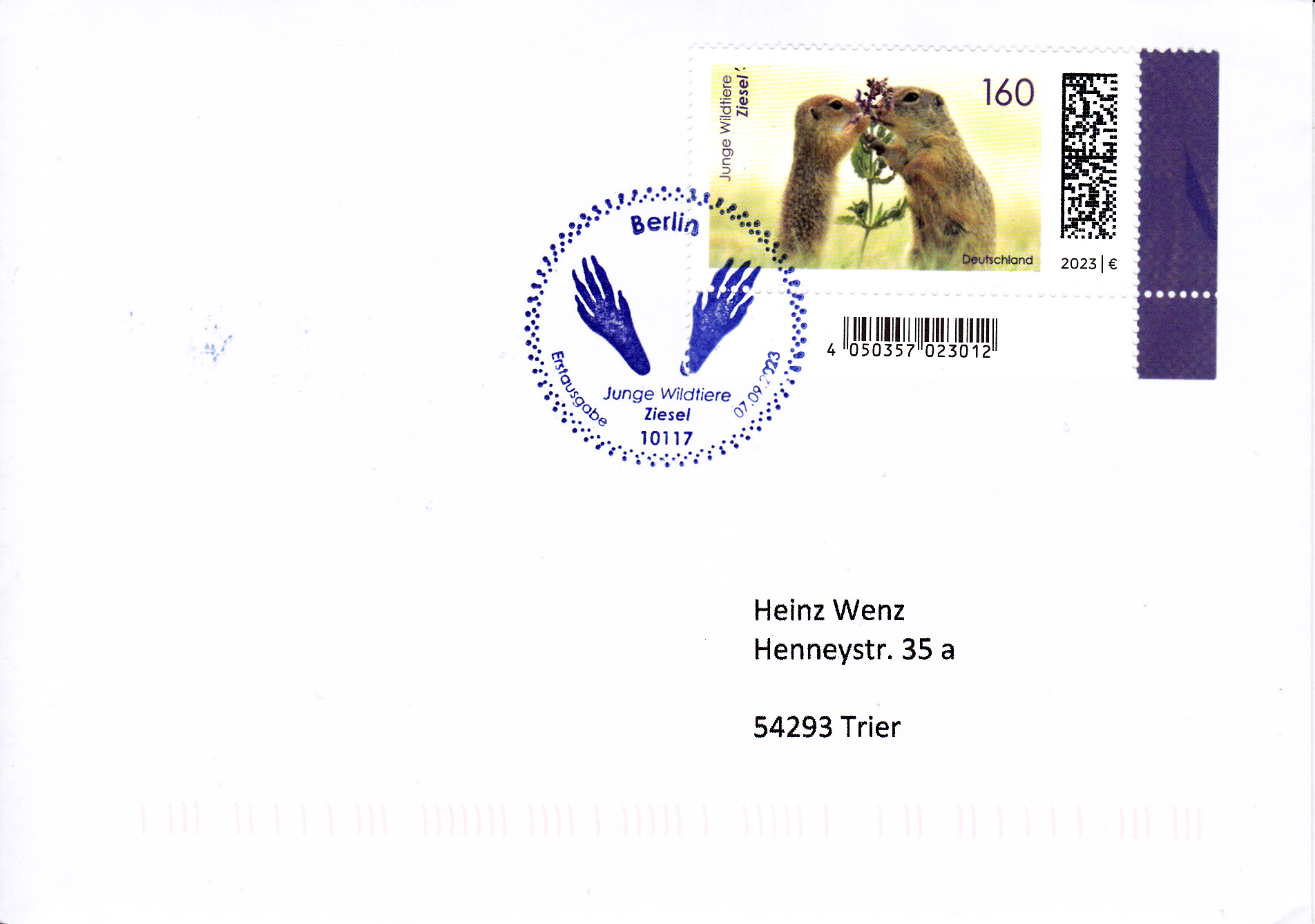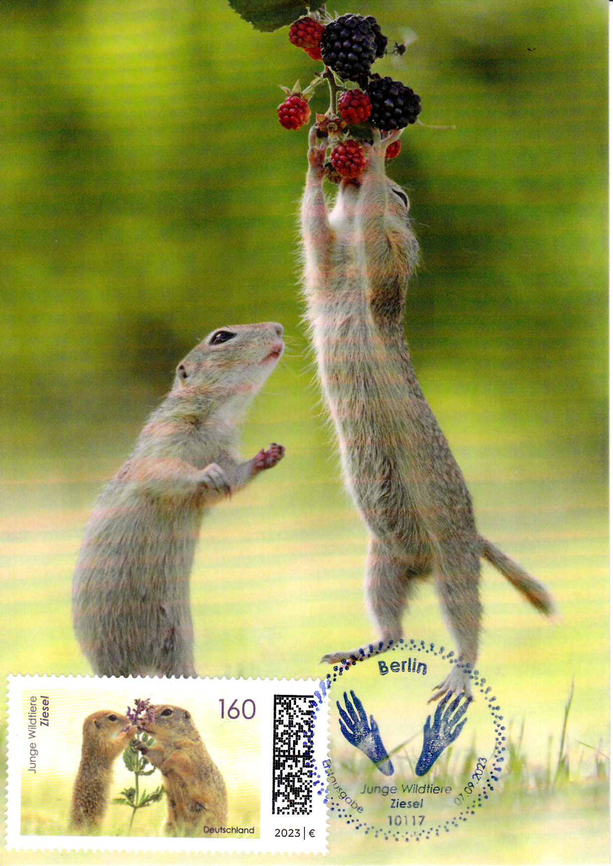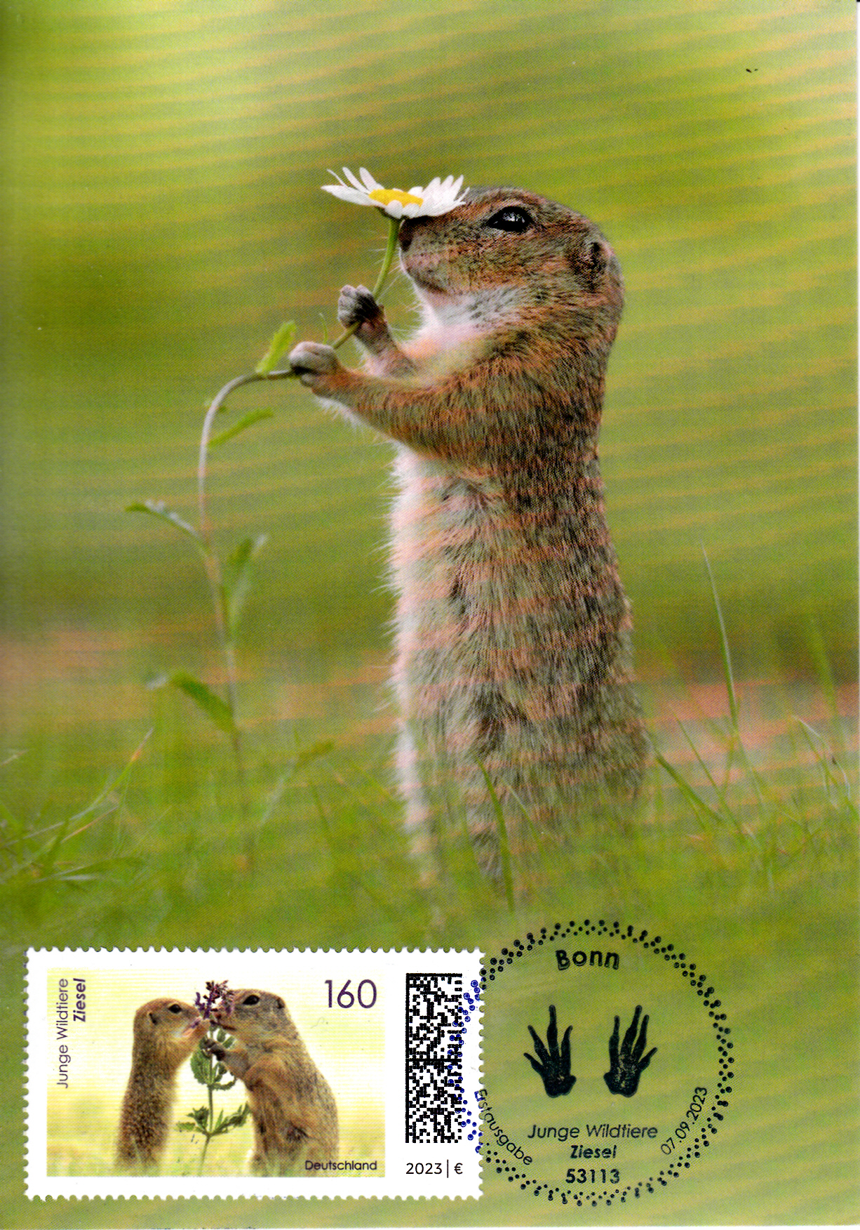 In der Serie "Tierbabys" ist bei der Deutschen Post eine Marke (MiNr 3782) mit zwei Europäischen Ziesel (Spermophilus citellus) an Steppensalbei (Salvia nemorosa) erschienen. Hier zeige ich eine Marke vom Eckrand mit EAN-Codierung.