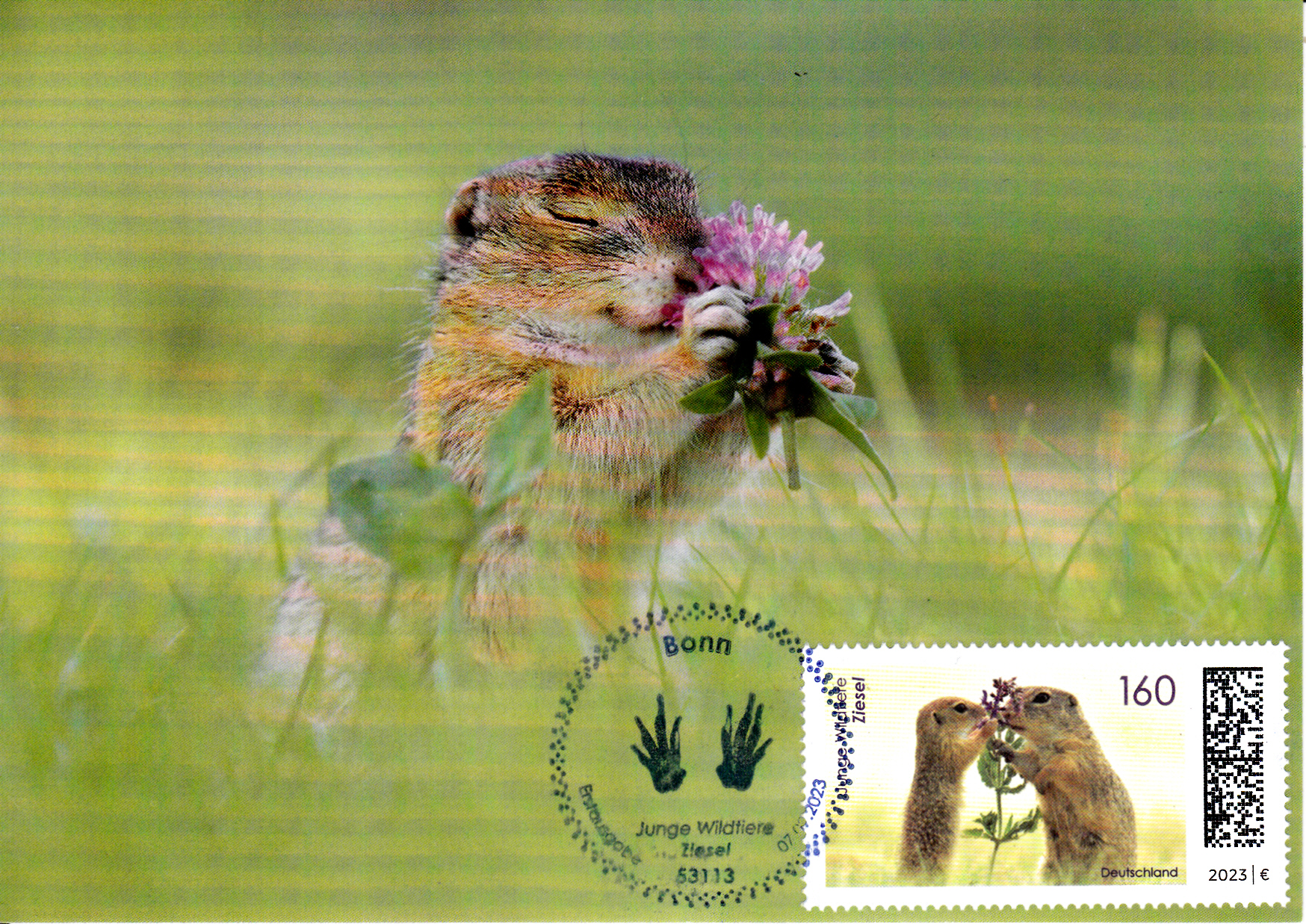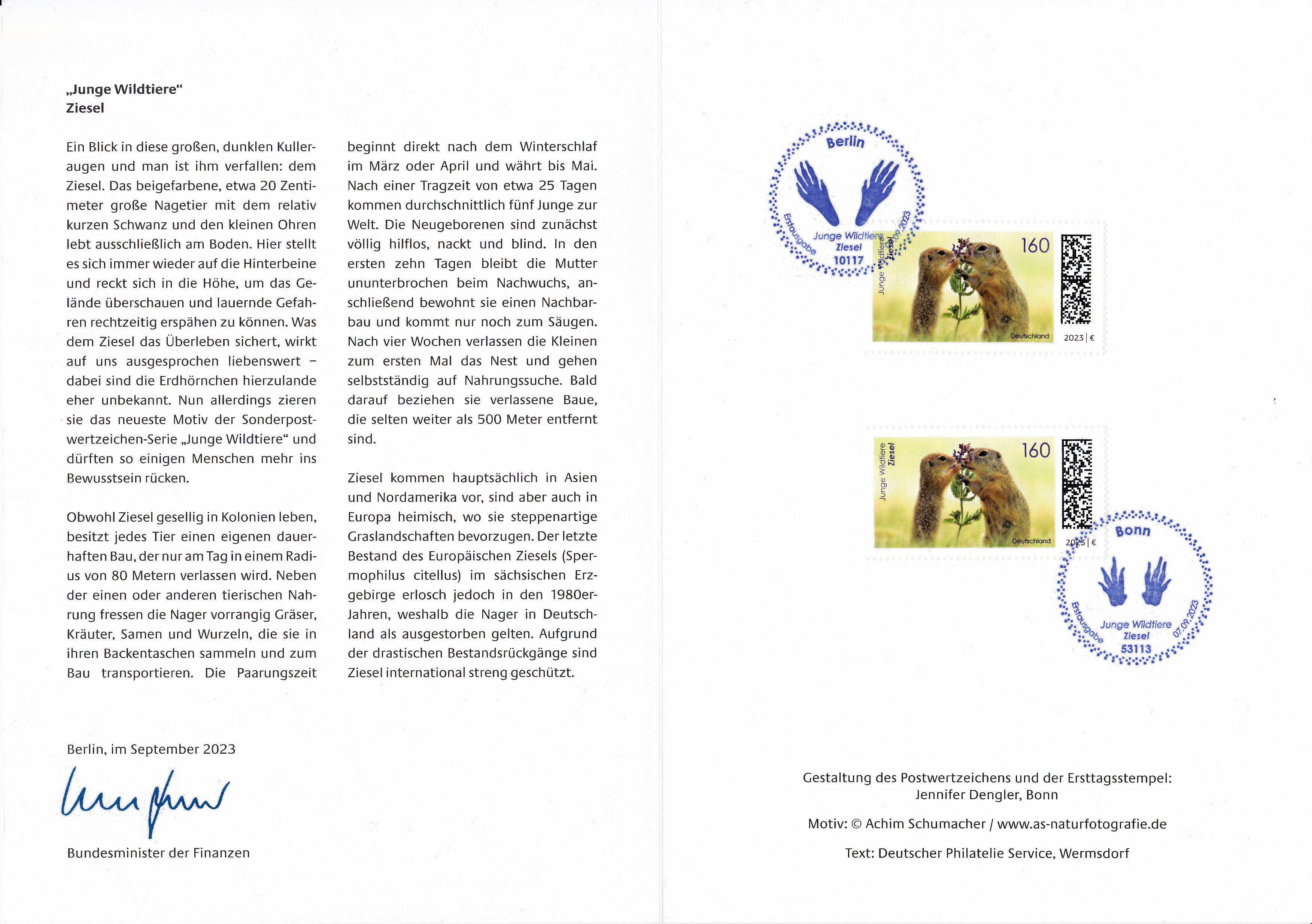 Ministerkarte des Bundesministers für Finanzen mit zwei Marken (MiNr 3782) mit dem Motiv "Zwei Europäische Ziesel (Spermophilus citellus) an Steppensalbei (Salvia nemorosa)" aus der Serie "Tierbabys" und den beiden Ersttagsonderstempel Bonn und Berlin.