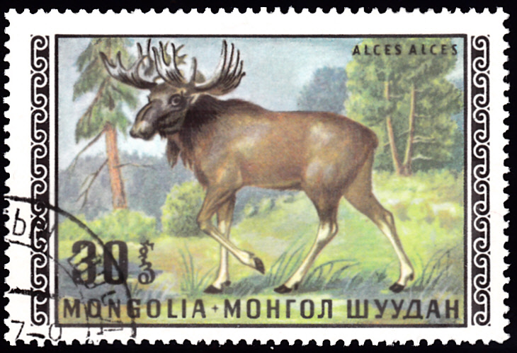 Diese Marke aus einer Serie "Einheimische Tierwelt" aus der Mongolei (MiNr 58") zeigt einen Elch (Alces alces).