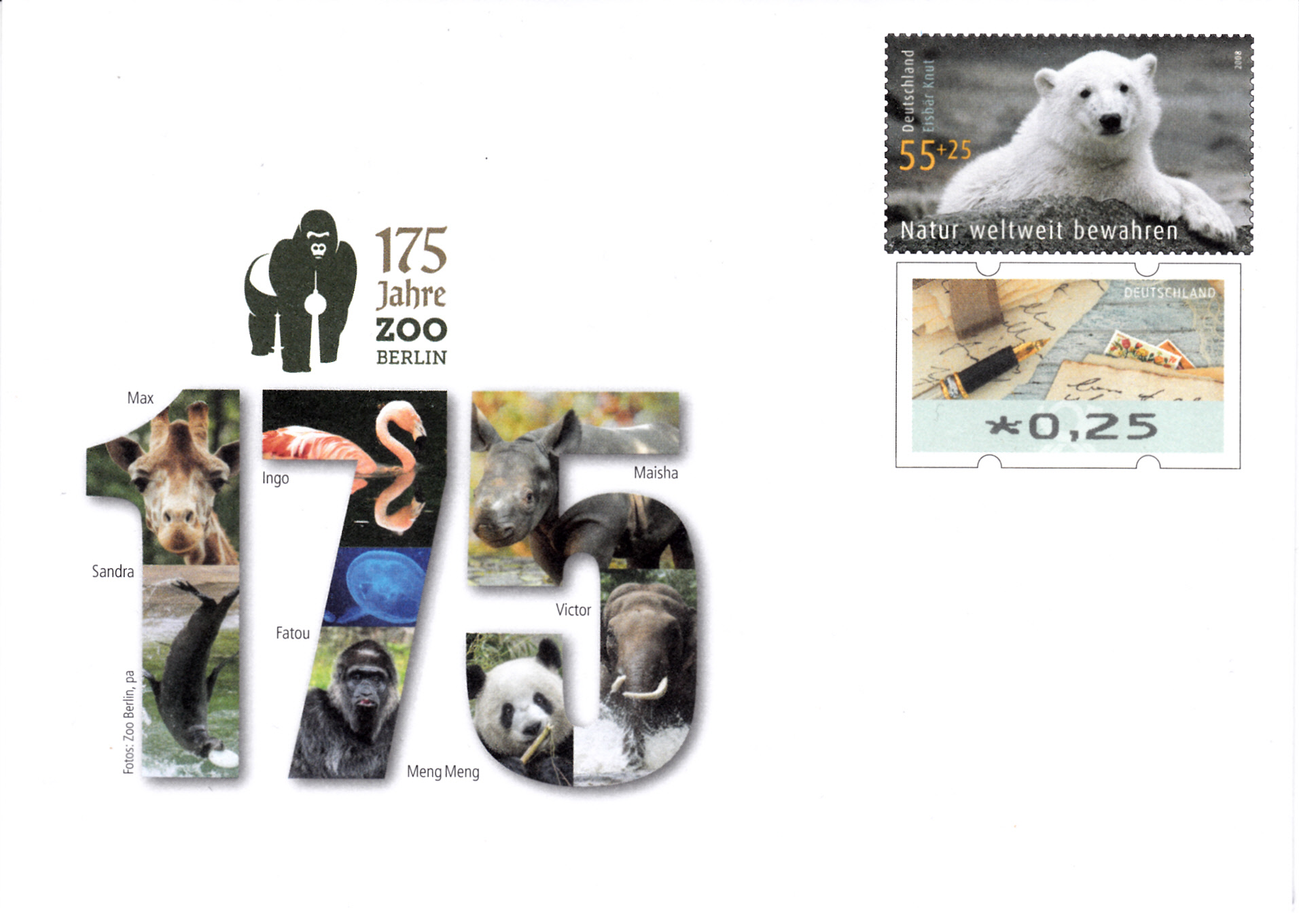 Zum Jubiläum "175 Jahre Zoo Berlin" erschien eine Gedenkganzsache ebenfalls mit dem Wertstempel der Zuschlagsmarke "Umweltschutz" aus dem Jahre 2008 mit dem Eisbären "Knut" (MiNr 2656) und einer Automatenmarke zu 25 Cent (MiNr 8).