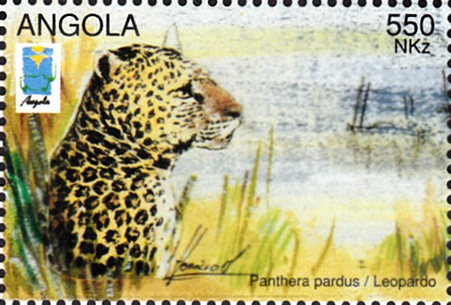 In der gleichen Serie aus Angola sind auch vier Marken erschienen, die das Jagdverhalten eines Leoparden zeigt. Hier auf dieser Marke (MiNr 1012) wird ein Leopard, der nach Beute Ausschau hält, abgebildet.