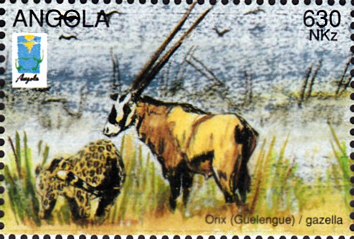 Aber es ist zu spät. Mit einem raschen Sprung erreicht der Leopard die Oryx-Gazelle und töten diese mit einem Biss in den Nacken oder die Kehle. Dies wird auf dieser Marke (MiNr 1017) gezeigt.