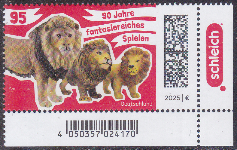 Zum Jubiläum "90 Jahre Schleich" erschien bei der Deutschen Post eine Marke (MiNr 3882)( mit drei Spoelfiguren "Löwen (Panthera leo)" der Firma Schleich aus verschiedenen Produktionszeiträumen. Hier zeige ich eine Marke vom Eckrand mit EAN-Codierung.