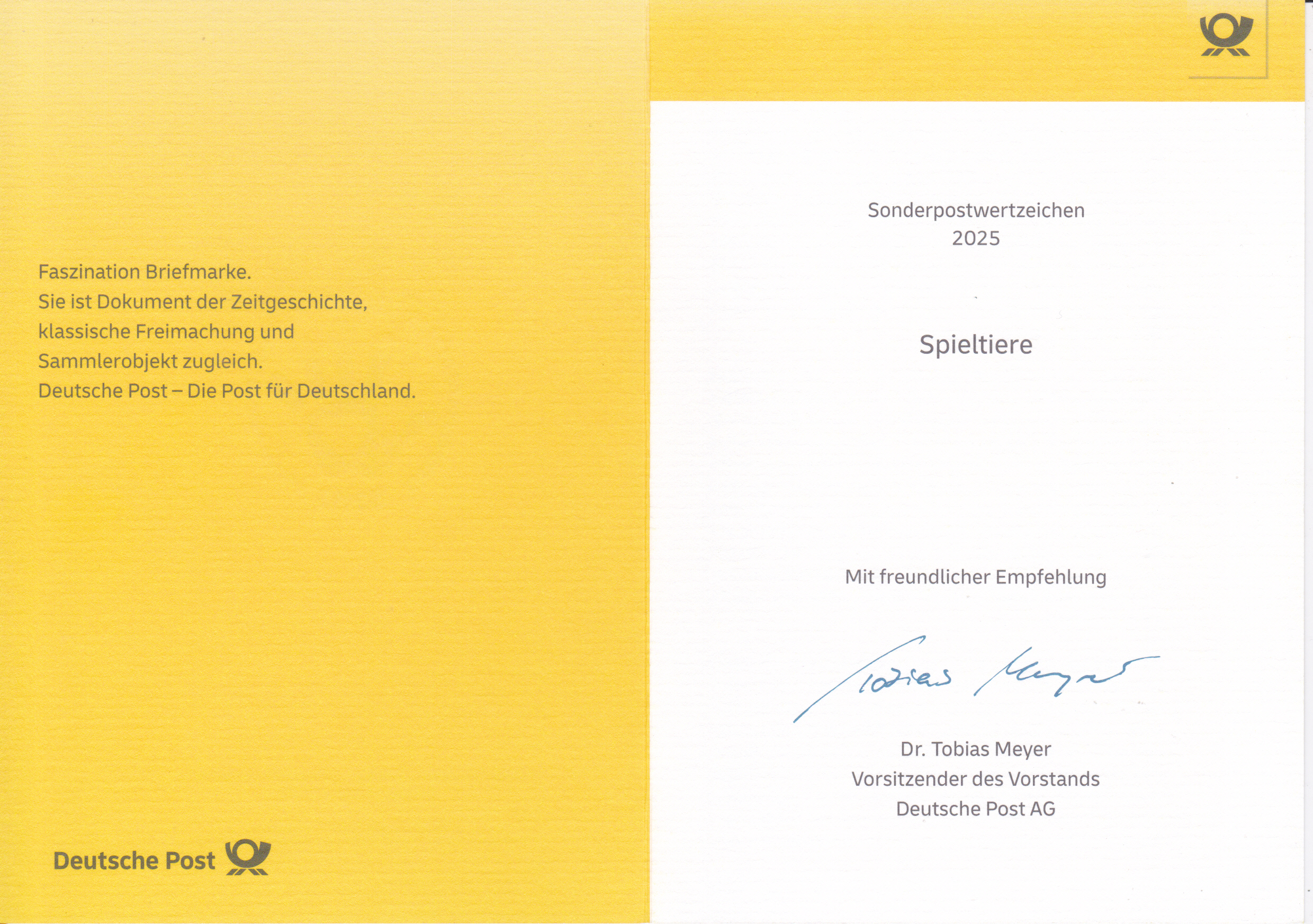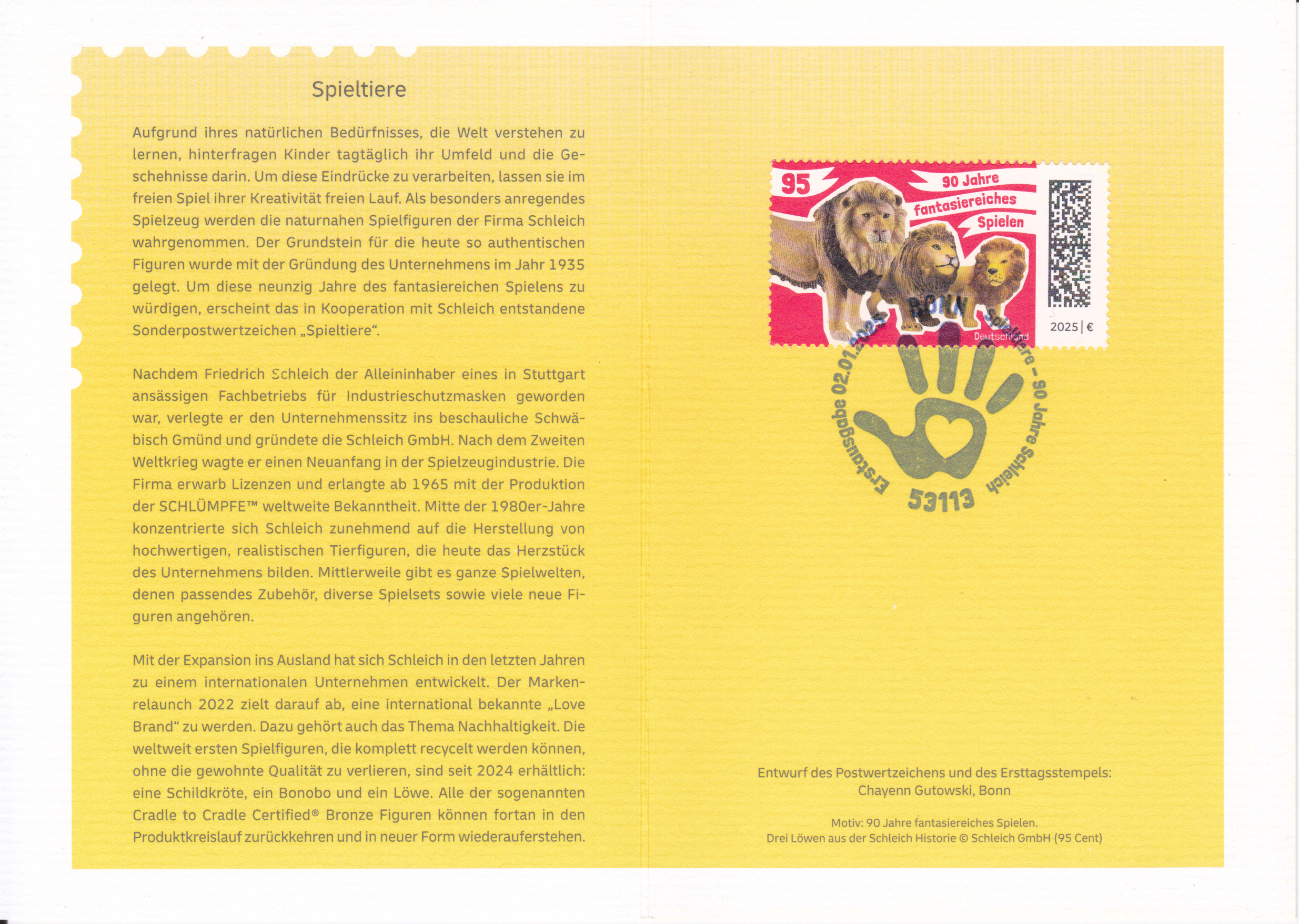 Klappkarte des Vorstandsvorsitzenden der Deutschen Post AG mit der Marke (MiNr 3882) zum Jubiläum "90 Jahre Schleich" und dem Ersttagsonderstempel Bonn.