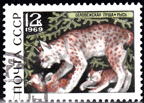 Aus einer Serie "Naturschutzpark Belowesch" kommt diese Marke aus der Sowjetunion (MiNr 3670) mit einem Luchs mit seinen Jungen.