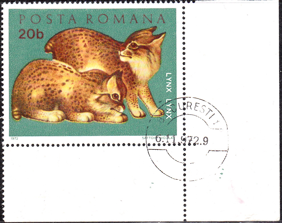 Dieses Eckrandstück einer Marke aus Rumänien (MiNr 3005) zeigt zwei junge Luchse.