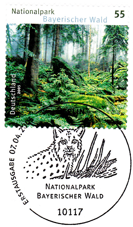 Der Ersttagsonderstempel aus Berlin zur Marke "Nationalpark Bayerischer Wald" zeigt im Stempelbild einen Luchs.