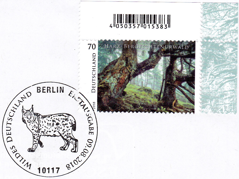 Im Ersttagsonderstempel zur Markenausgabe "Wildes Deutschland" 2018, die einen Bergfichtenurwald am Brocken im Harz zeigt, ist ein Eurasischer Luchs (Lynx lynx) zu sehen.