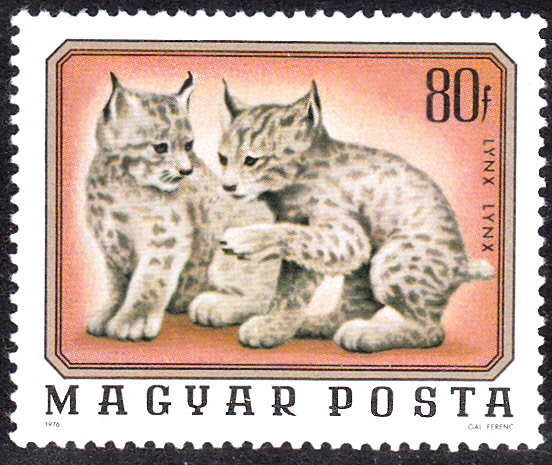 Zu einer Serie "Junge Wildtiere" aus Ungarn (MiNr 3100 A) gehört diese Marke, die zwei junge Luchse (Lynx lynx) zeigt.
