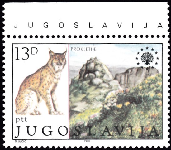 Diese Marke zum Thema "Europäischer Naturschutz" aus Jugoslawien (MiNr 1909) zeigt auf der linken Seite der Marke auch einen Eurasischen Luchs (Lynx lynx).