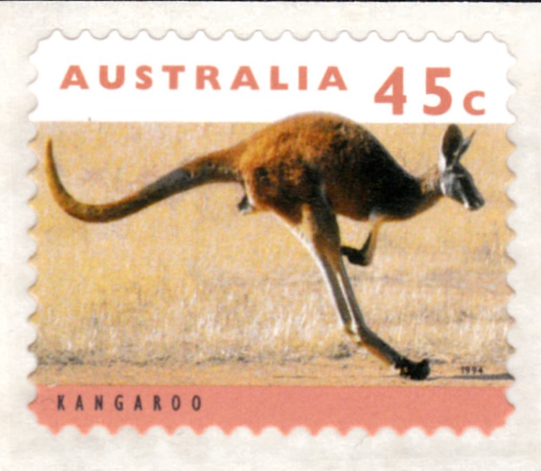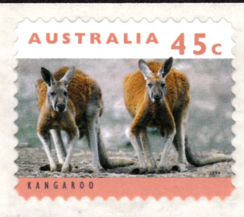 Hier zeige ich die Rollenmarke (MiNr 1408 I) mit dem springenden Roten Riesenkänguru (Macropus rufus).