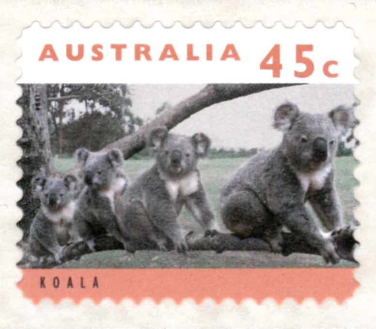 Jetzt kommt die Rollenmarke (MiNr 1411 I) mit der Koalamutter mit drei kleinen Koalas (Phascolarctos cinereus).
