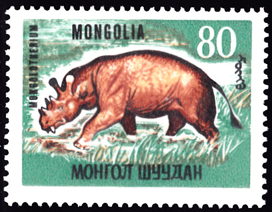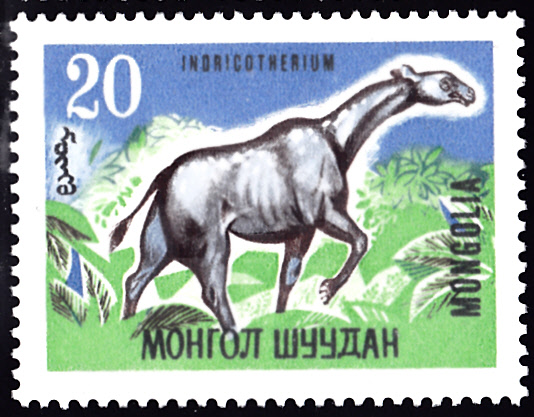 Paraceratherium (früher auch als Baluchitherium, Indricotherium oder Dzungariotherium beschrieben) ist eine Gattung aus der ausgestorbenen Familie der Indricotheriidae, die zu den Nashornartigen (Rhinocerotoidea) gehört und mit einem Gewicht von bis zu 20 Tonnen die größten landbewohnenden Säugetiere aller Zeiten stellte. Die Gattung lebte im Oligozän und im untersten Miozän vor etwa 34 bis rund 22 Millionen Jahren. Sie ist von zahlreichen, teils gut erhaltenen Fossilresten aus Ost-, Zentral- und Westasien bekannt, kam aber auch im heutigen Südosteuropa vor. Der Name Paraceratherium leitet sich aus den griechischen Wörtern παρά (pará) für "neben", κέρας (keras) für "Horn" und θηρίον (thēríon) für "Tier" ab und bezieht sich auf die nahe Verwandtschaft mit den Nashörnern. Wegen der Verwandtschafz zu den Nashörner szelle ich diese Marke auch hier im Thema "Nashörner" ein.