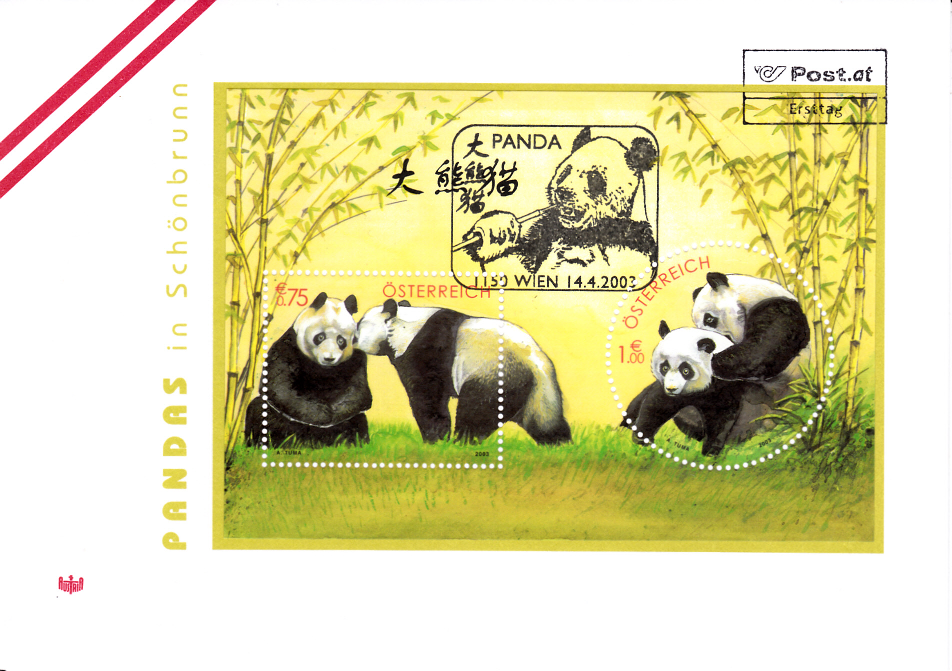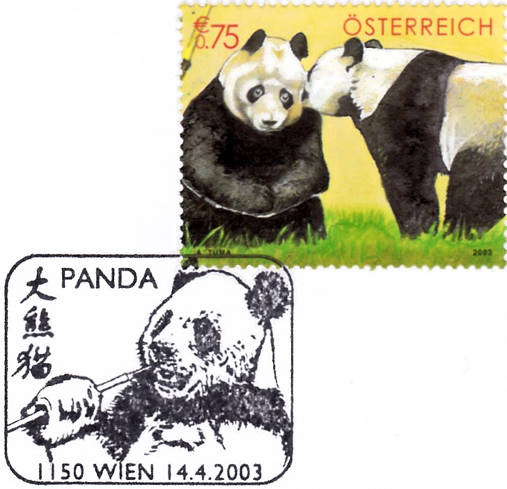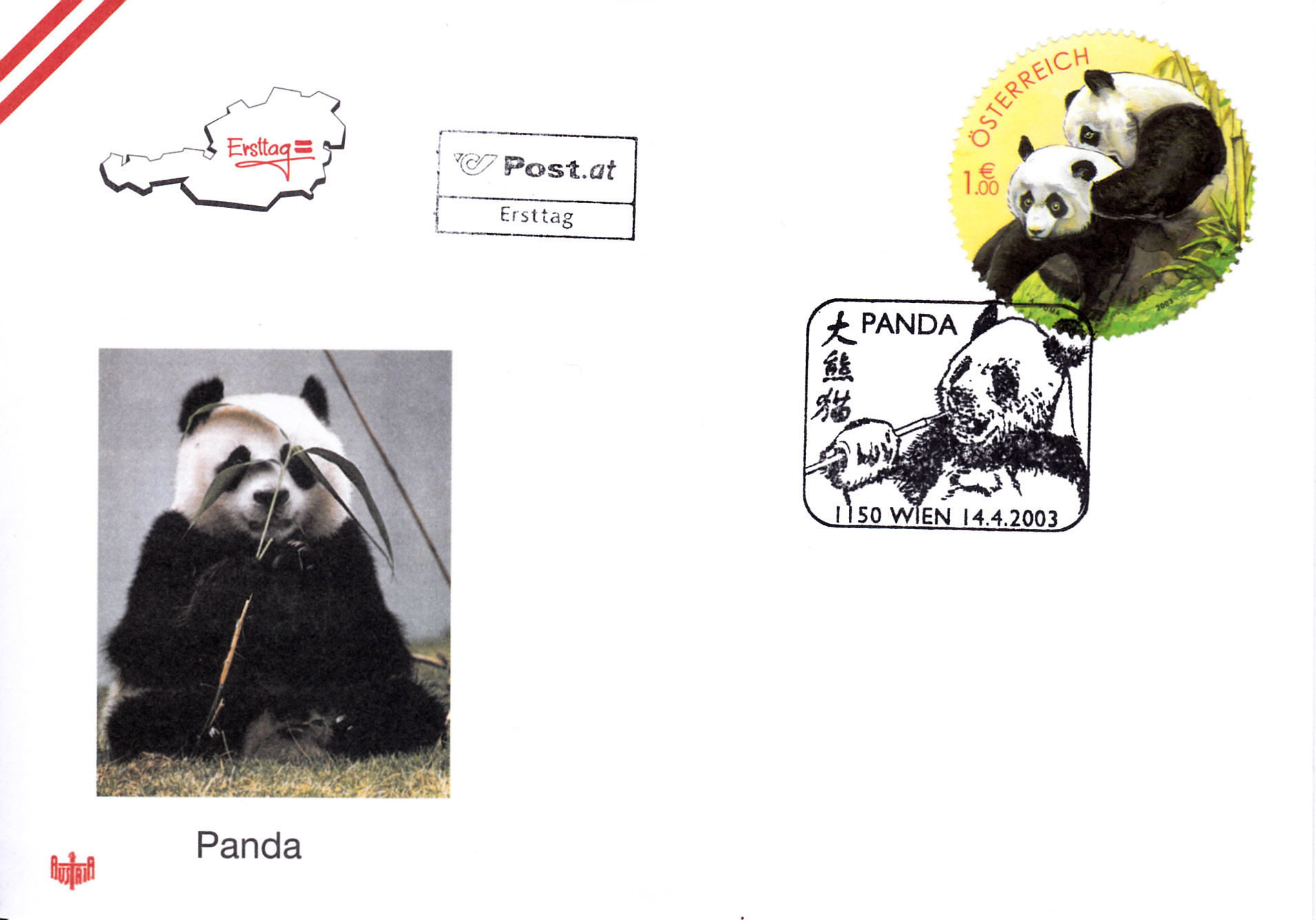 FDC mit der Marke zu 0,85€ (MiNr 2409) mit zwei Riesenpanda (Ailuropoda melanoleuca) aus dem bereits hier gezeigten Block "Panda-Forschung im Tiergarten Schönbrunn" aus Österreich (MiNr Block 18) mit einem Sonderstempel aus Wien mit einem Riesenpanda (Ailuropoda melanoleuca) beim Fressen.