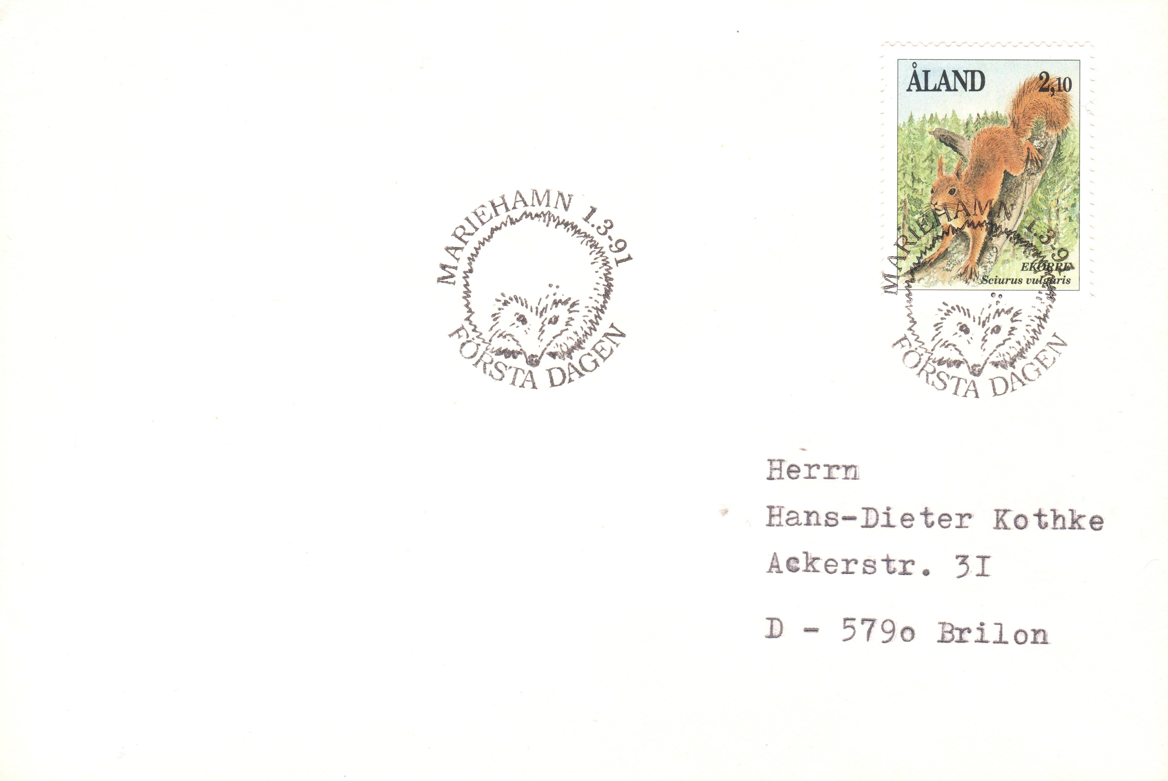 Dieser Ersttagsstempel (FÖRSTA DAGEN) aus Aland vom 01.03.1991 zeigt einen Igel: