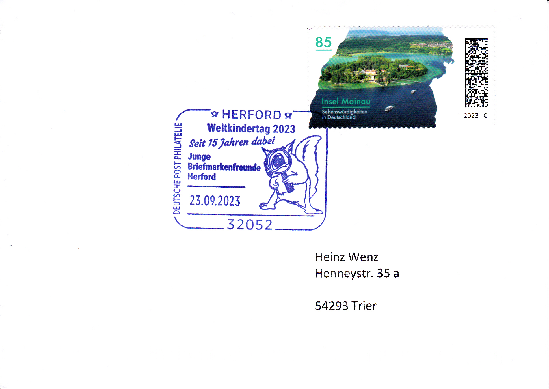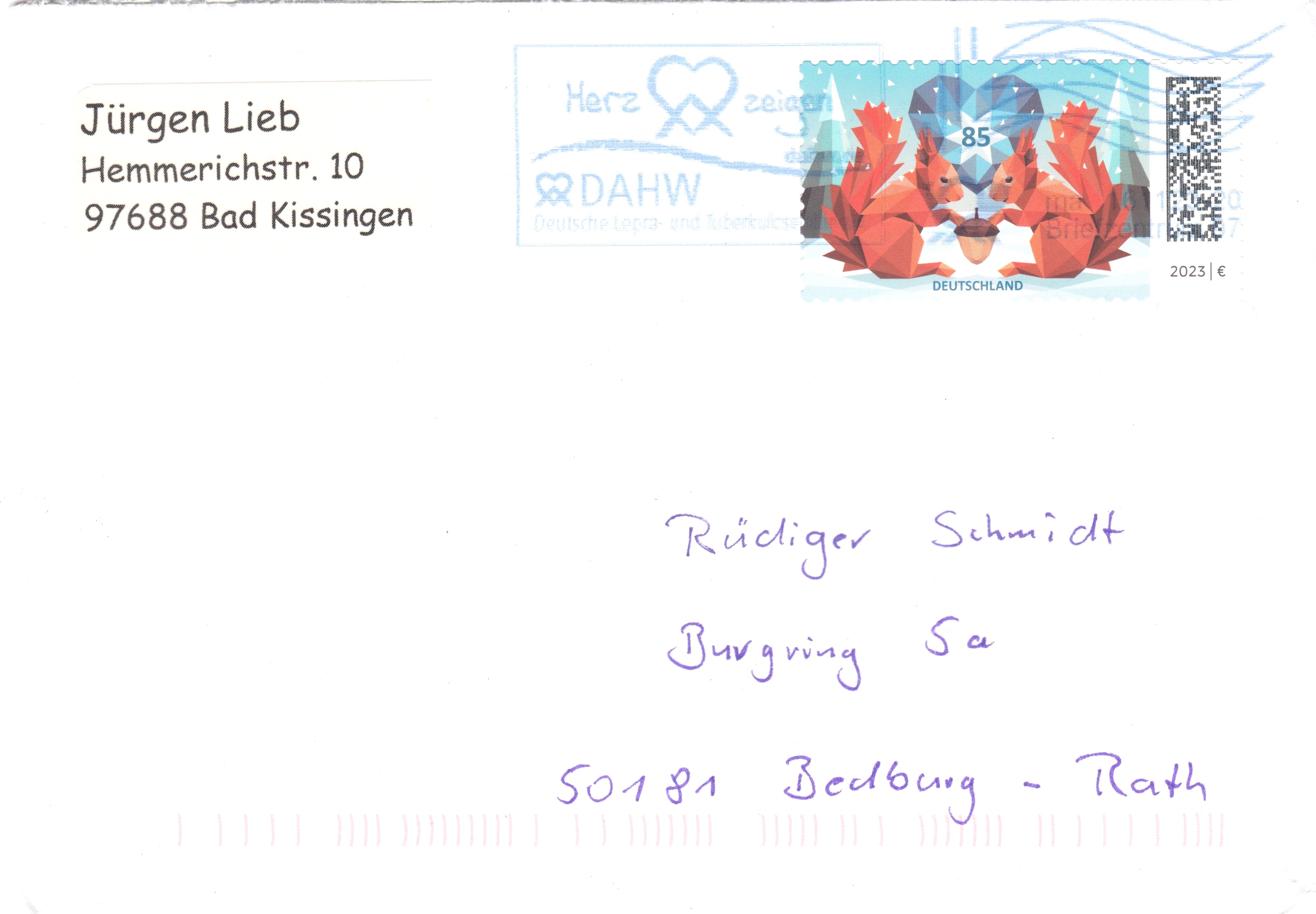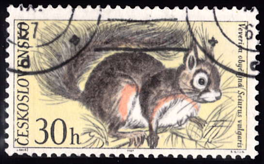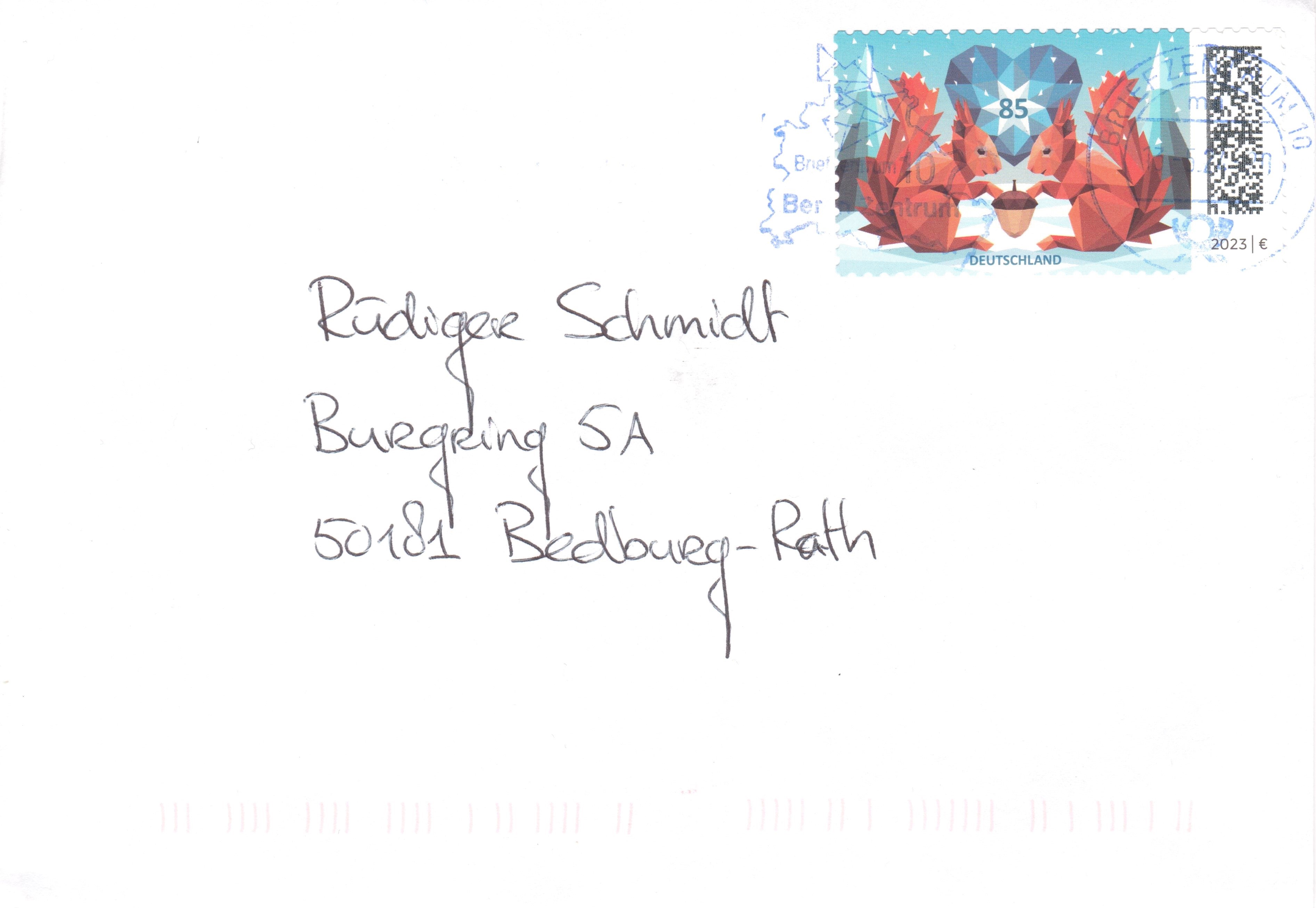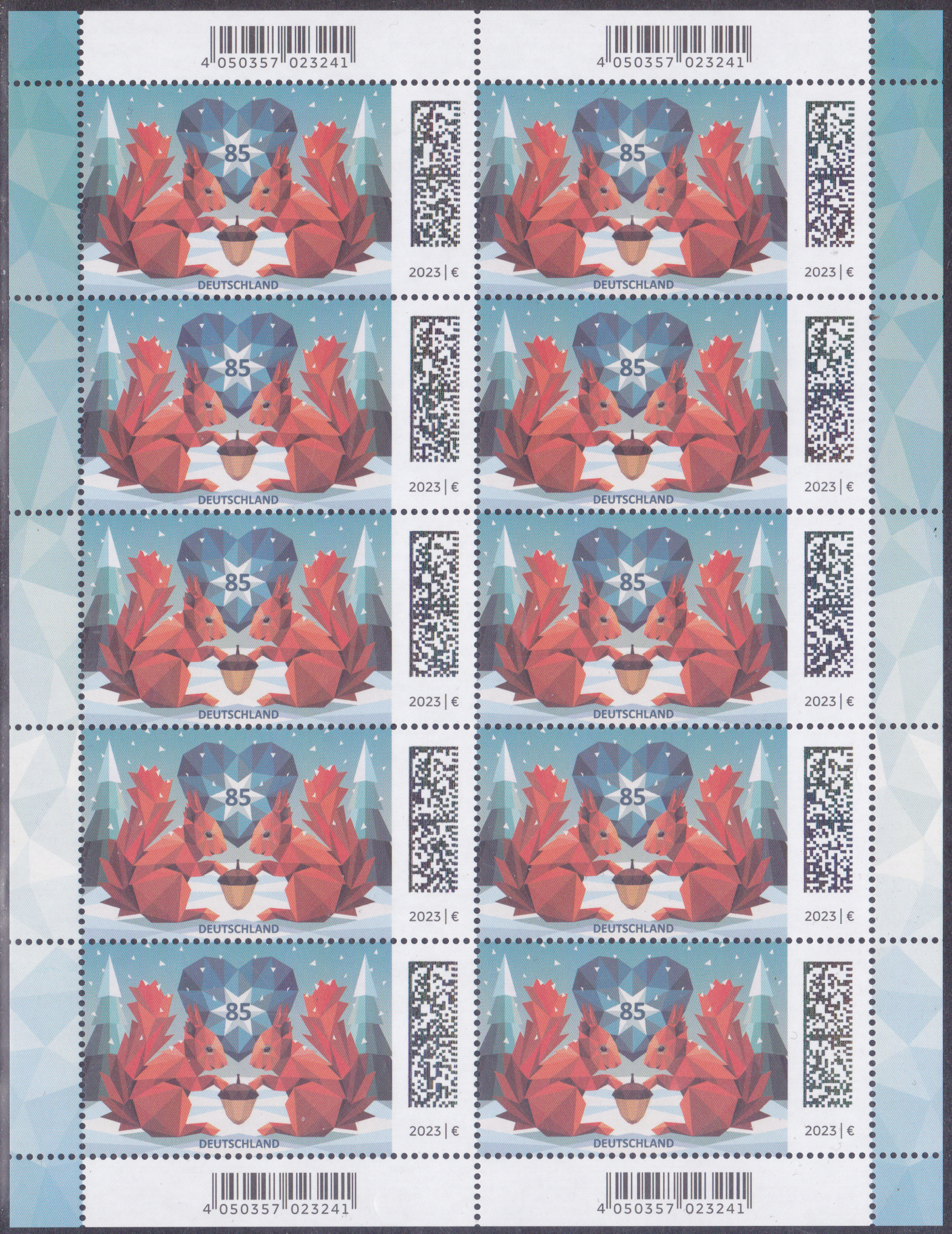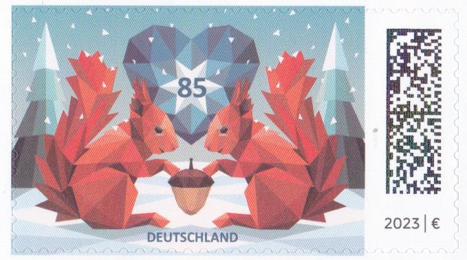 Auf dieser Marke der Deutschen Post (MiNr 3798) zeigt eine kubistische Darstellung zweier Eichhörnchen (Sciurus vulgaris) mit Eichel in einer Winterlandschaft. Hier bilde ich Eckrandstück mit EAN-Codier ab ab.