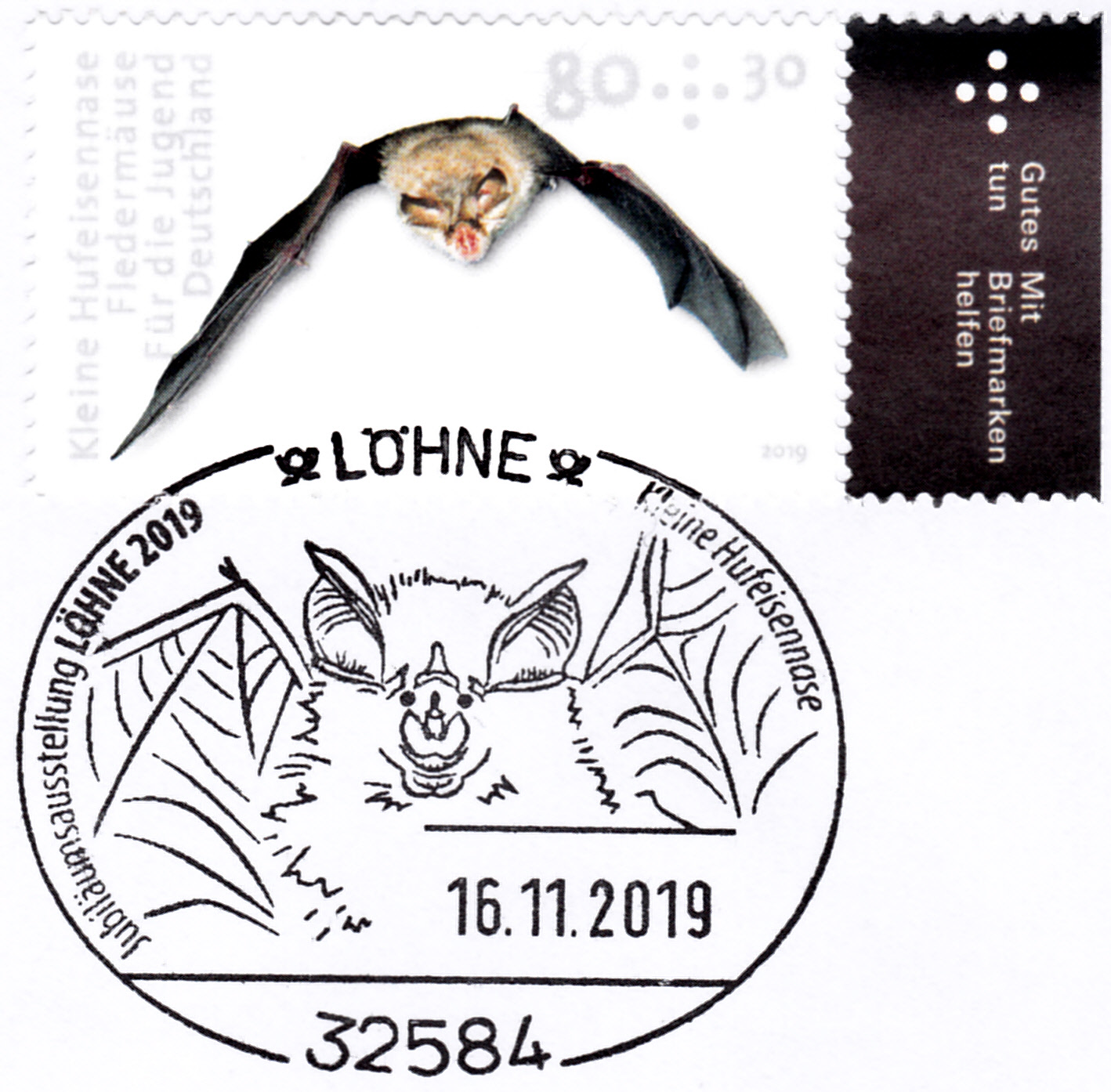 Im Sonderstempel aus Löhne vom 16.11.2019 ist eine weitere Kleine Hufeisennase abgebildet.