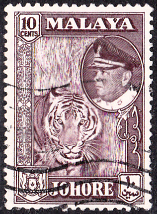 Diese Marke aus der Föderation Malaya Johore (MiNr 148) wird ein Tiger (Panthera tigris) gezeigt.
