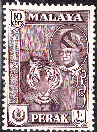 Hier noch eine weitere Marke mit diesem Motiv, jetzt aus der Föderation Malaya Perak (MiNr 108). Diese Marke gibt es in zwei Farbtönen: a = dunkelbraun (4.8.1957) und b = dunkelkarminbraun (21.2.1961).