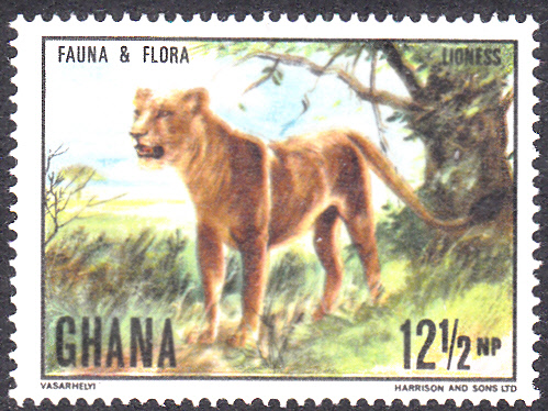 Aus Ghana kommt diese Marke (MiNr 414 A) mit einem Löwen (Panthera leo). Diese Marke gibt es auch geschnitten.
